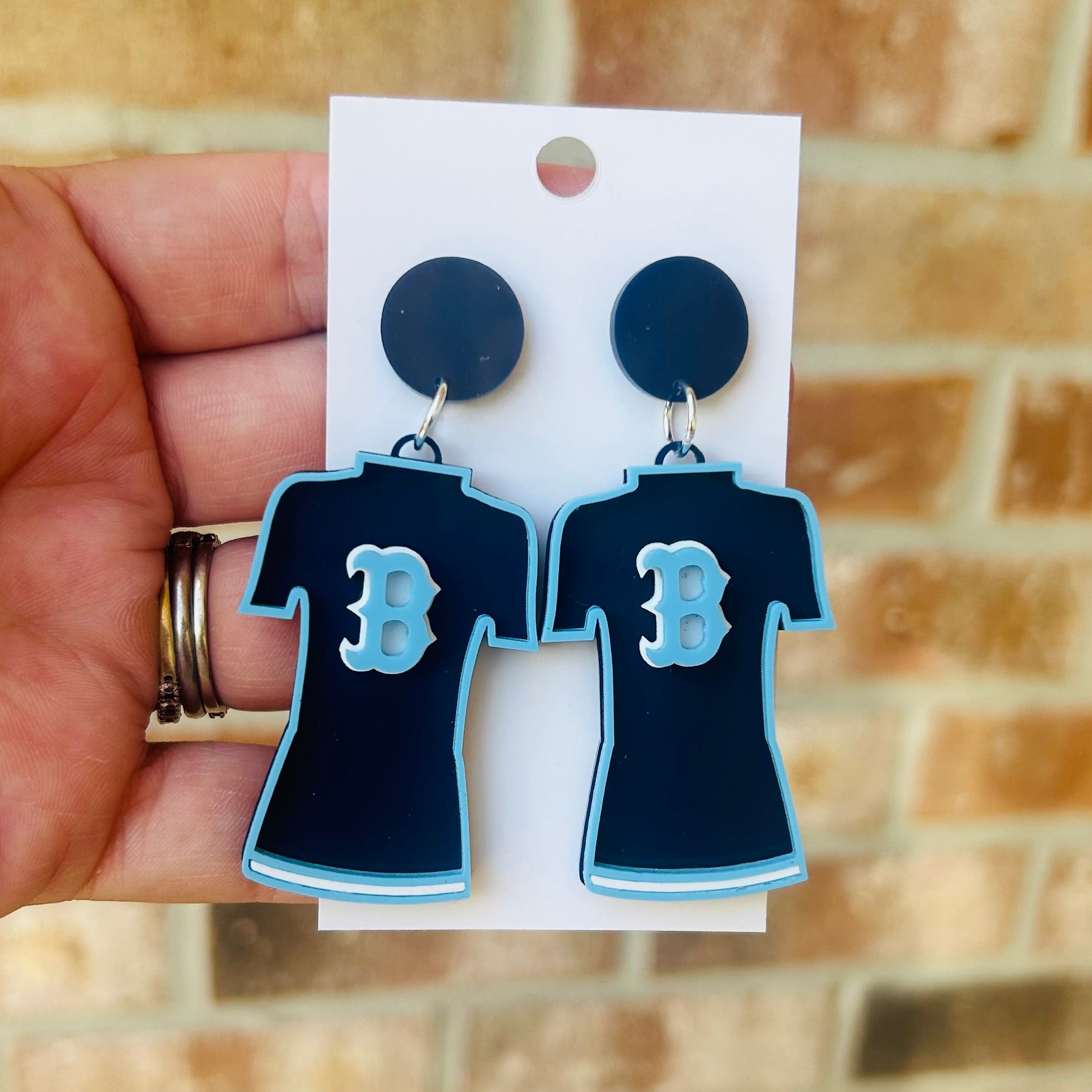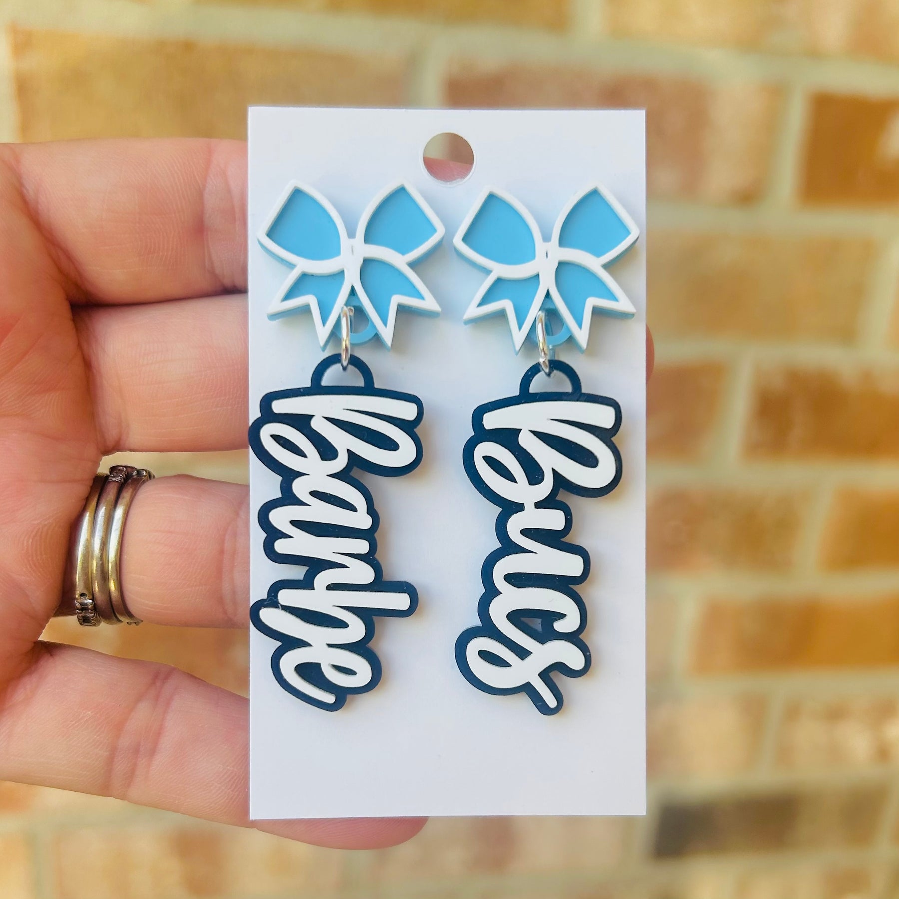 Barbe Bucs uniform and bow dangles. Navy white and Carolina blue
