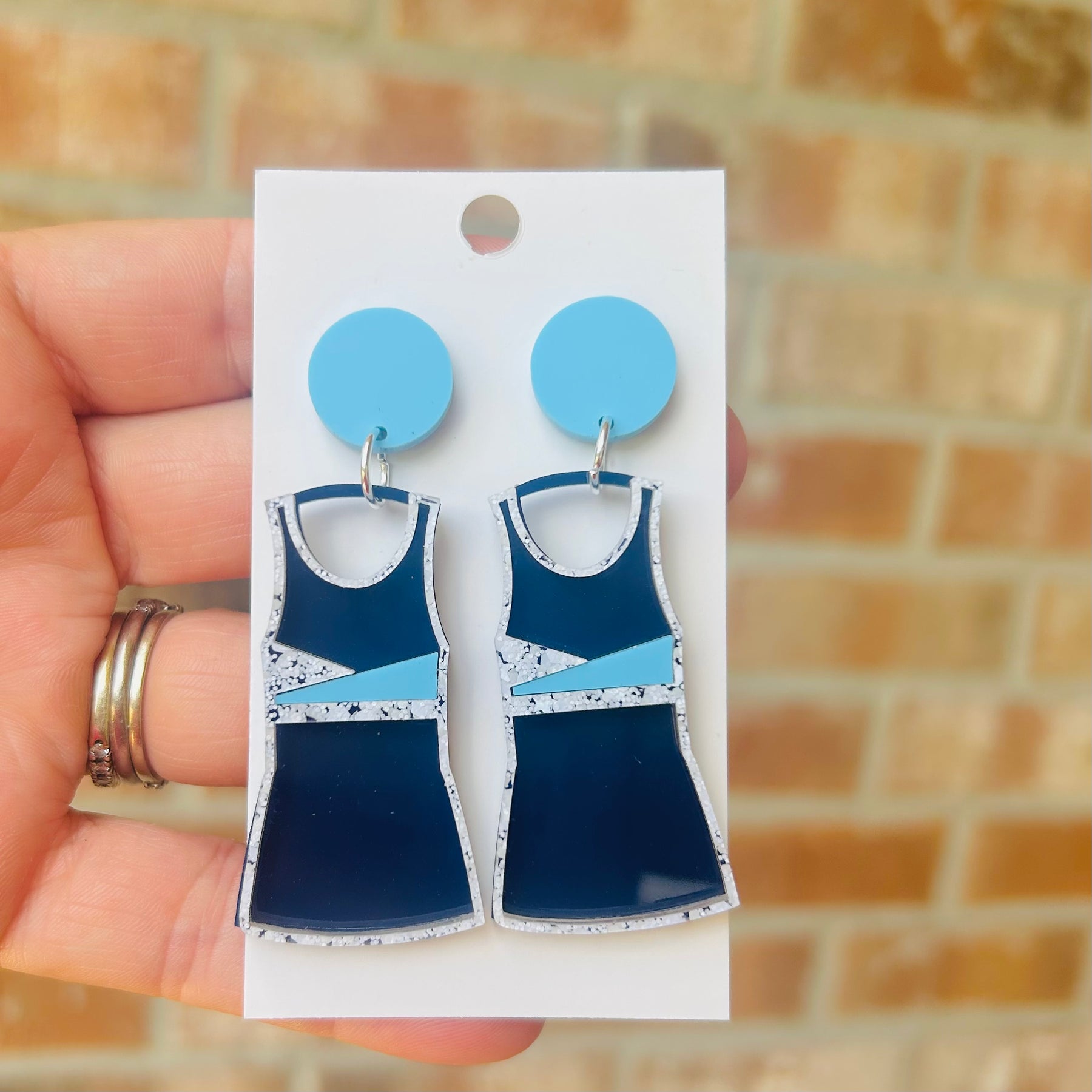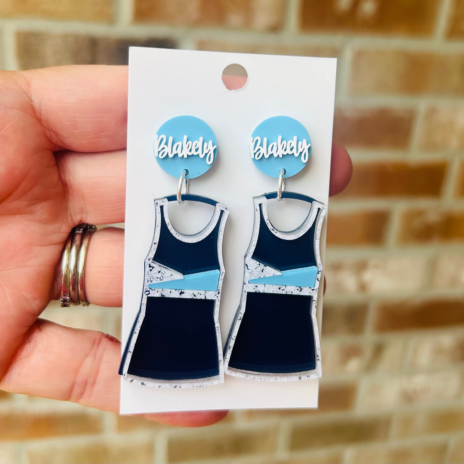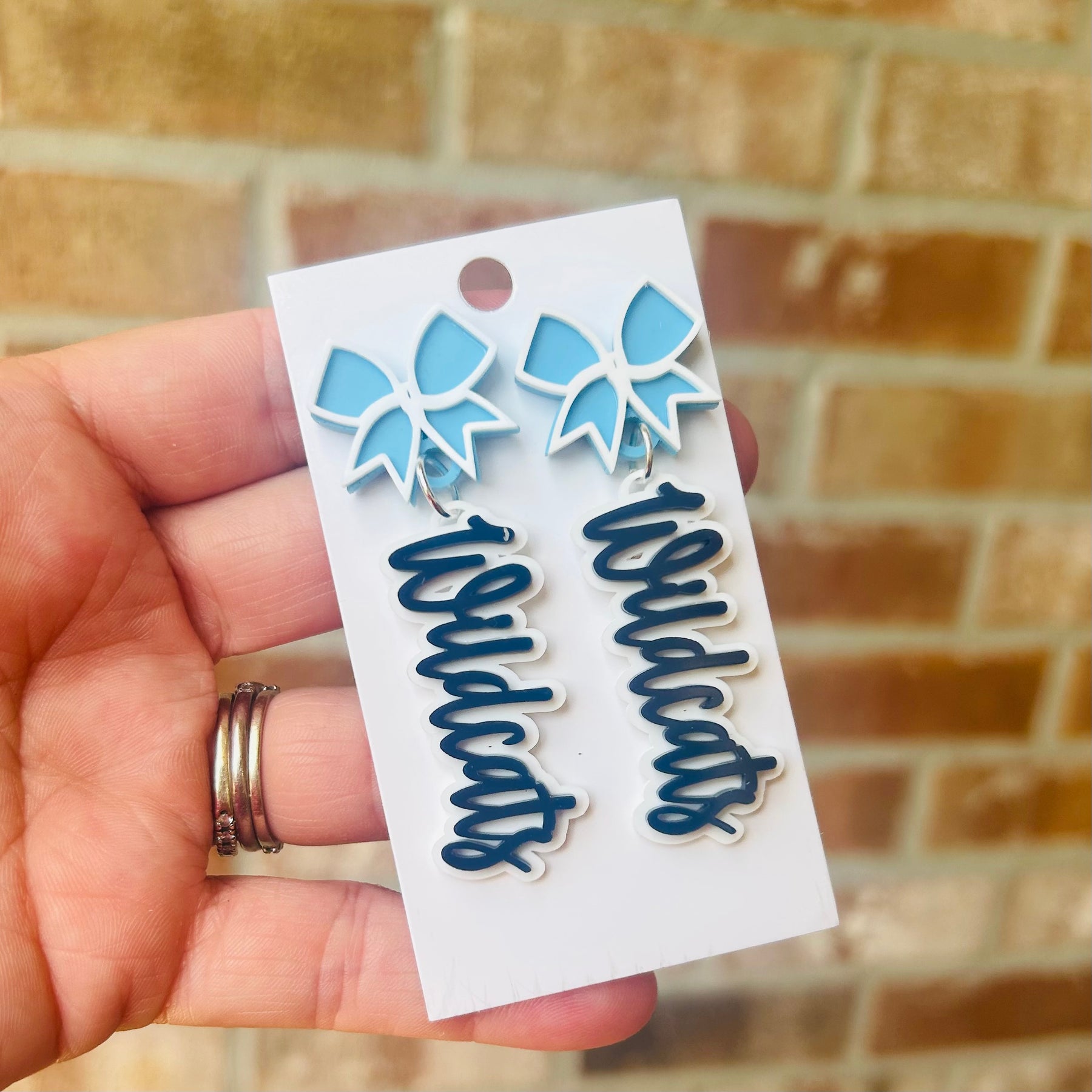 St Amant Wildcats navy Carolina blue and white. Bow dangles and uniform