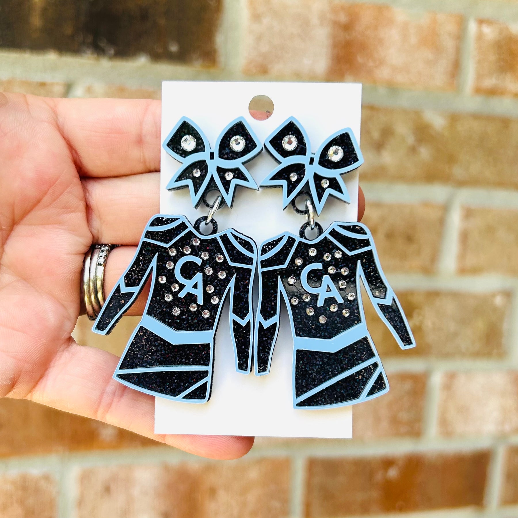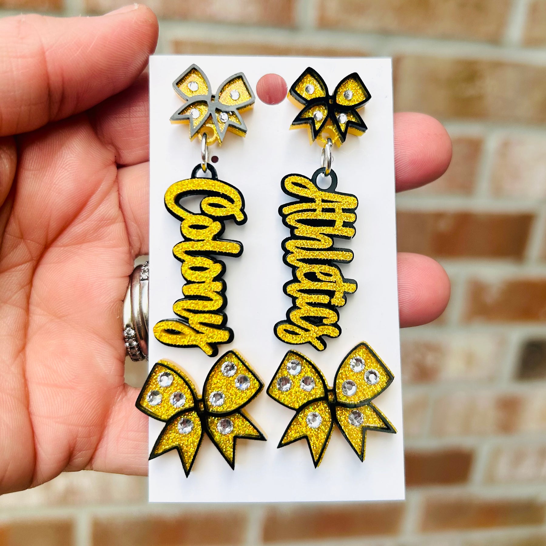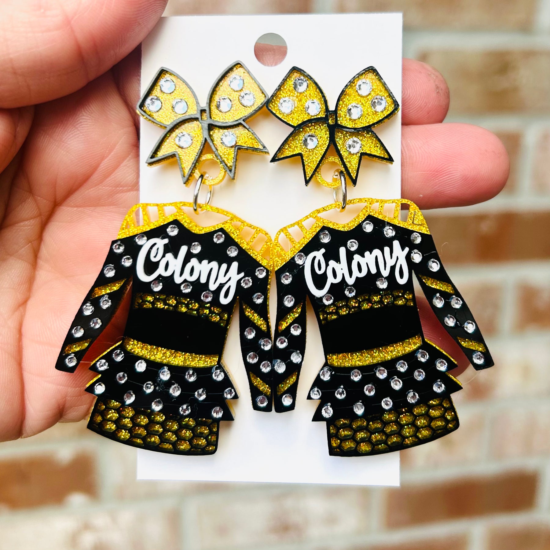 Colony Athletics Cheer Uniform and bow dangles and studs black and gold