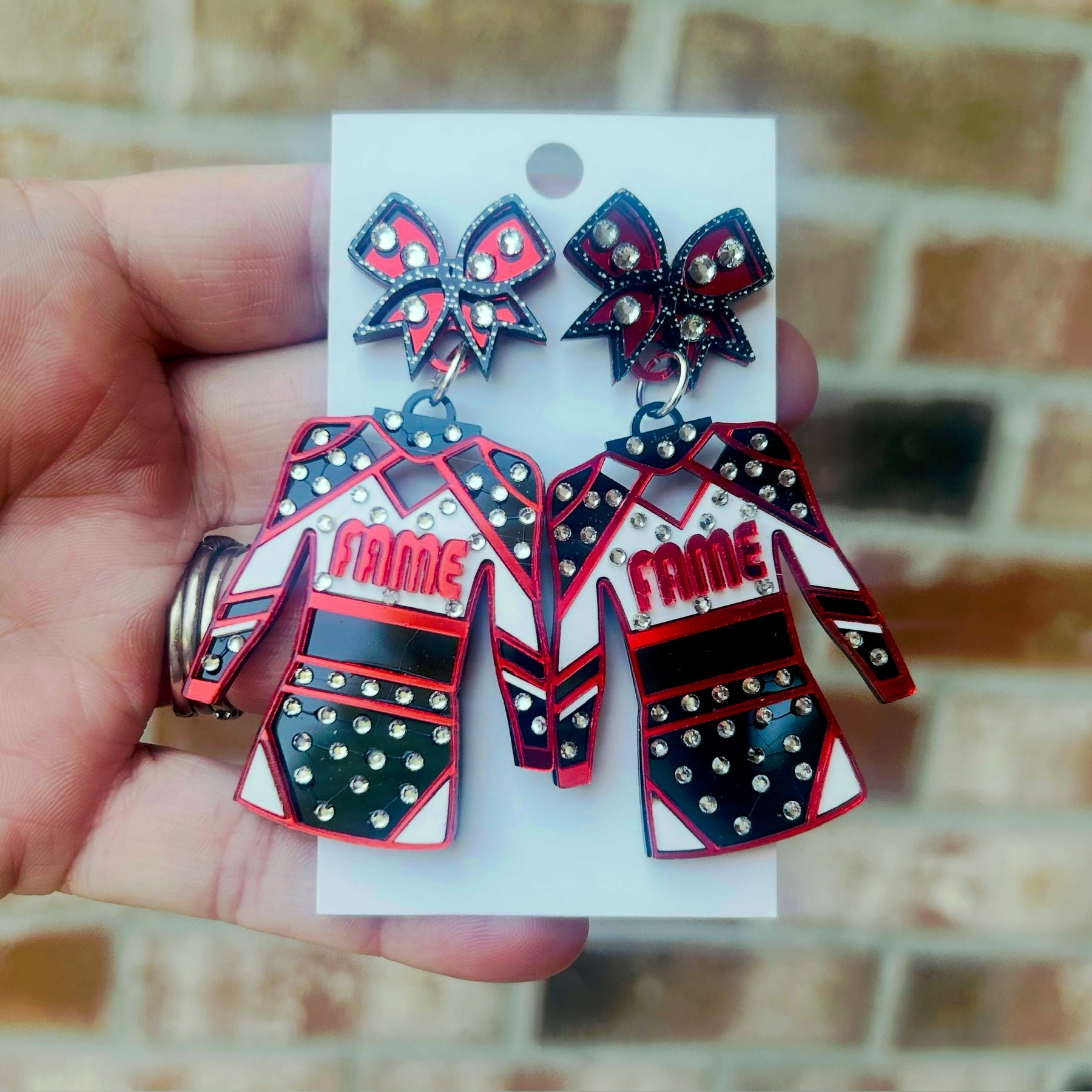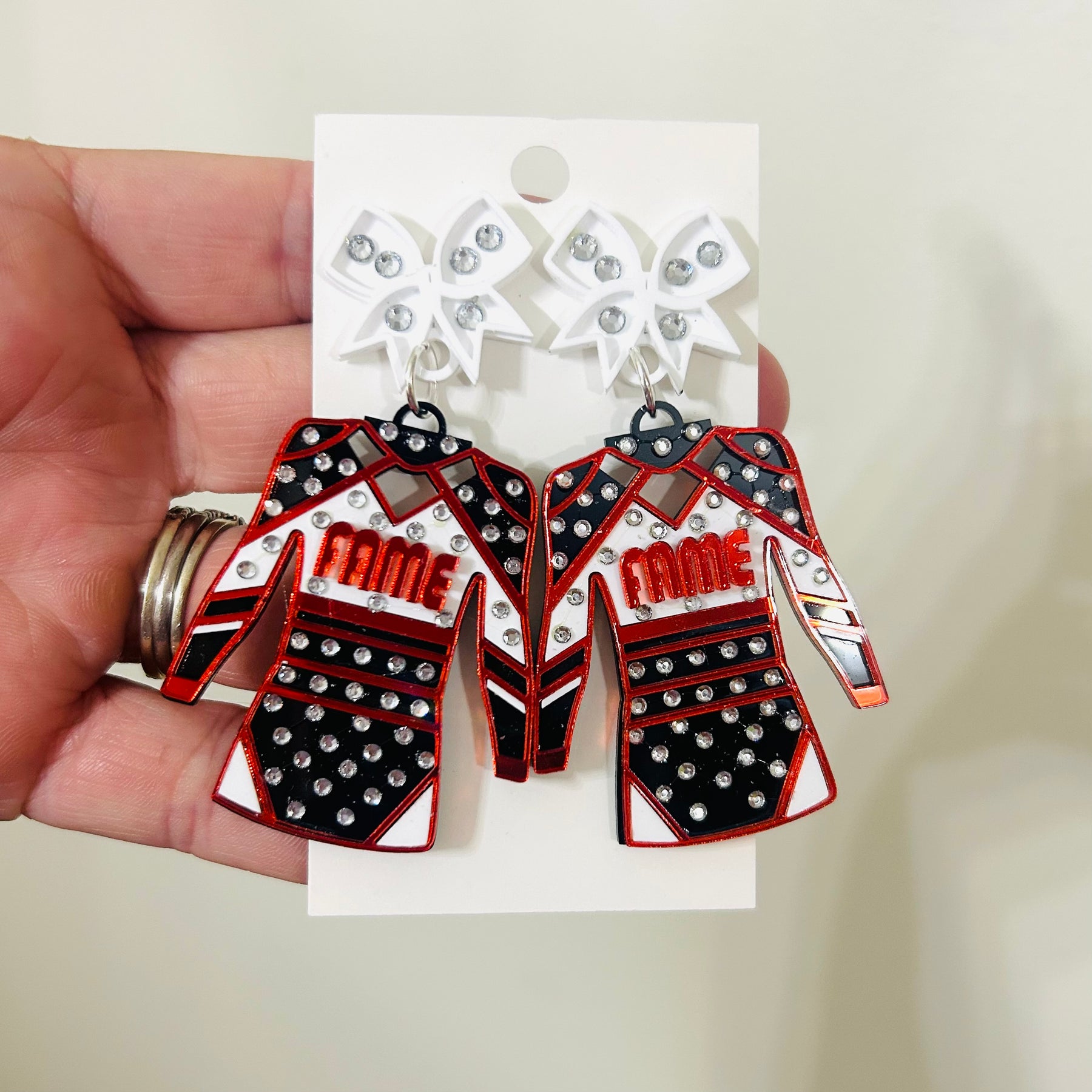 Fame athletics - cheer uniform replicas. Red white and black with a bow dangle