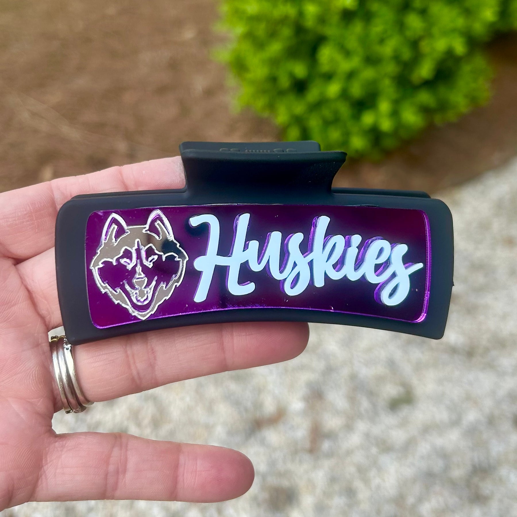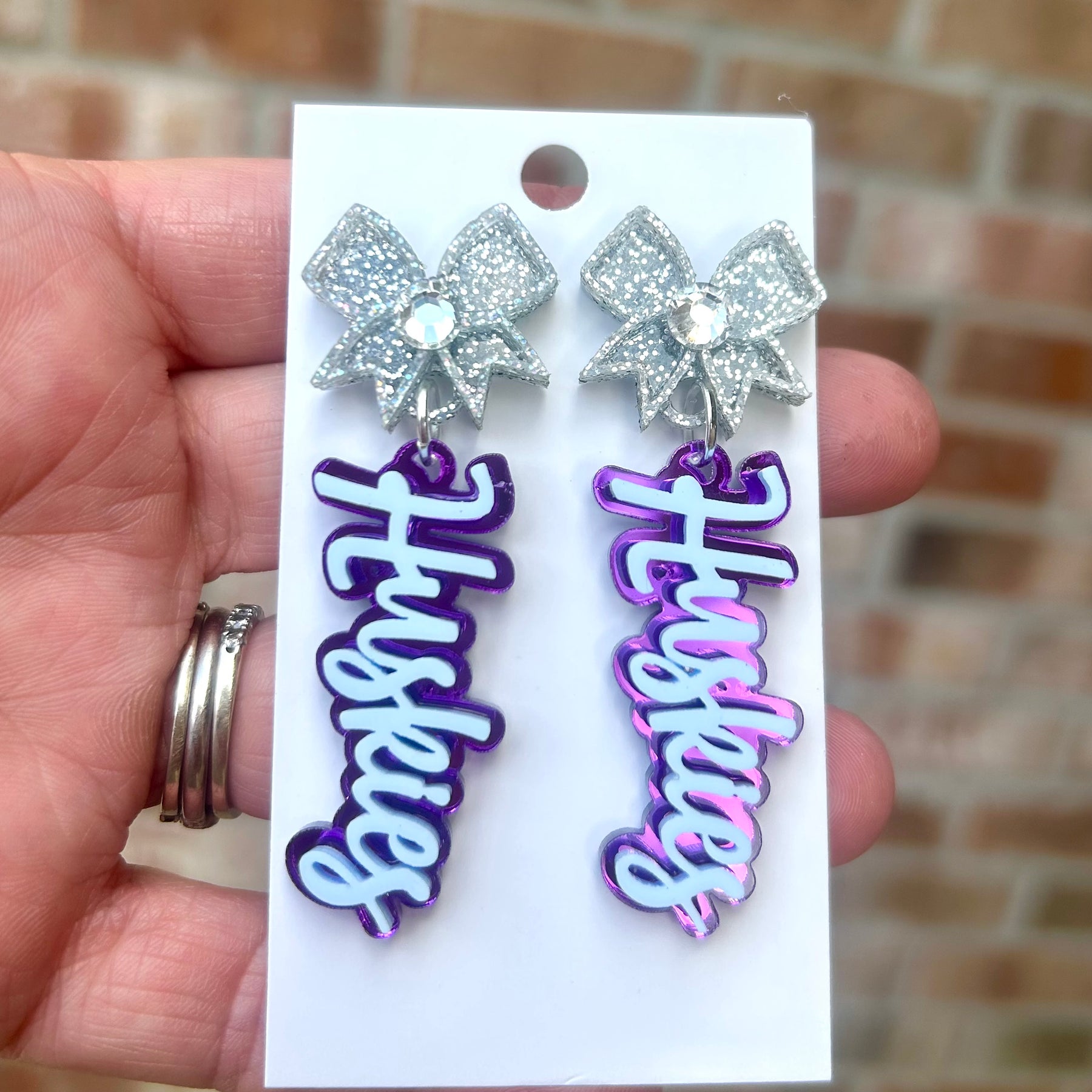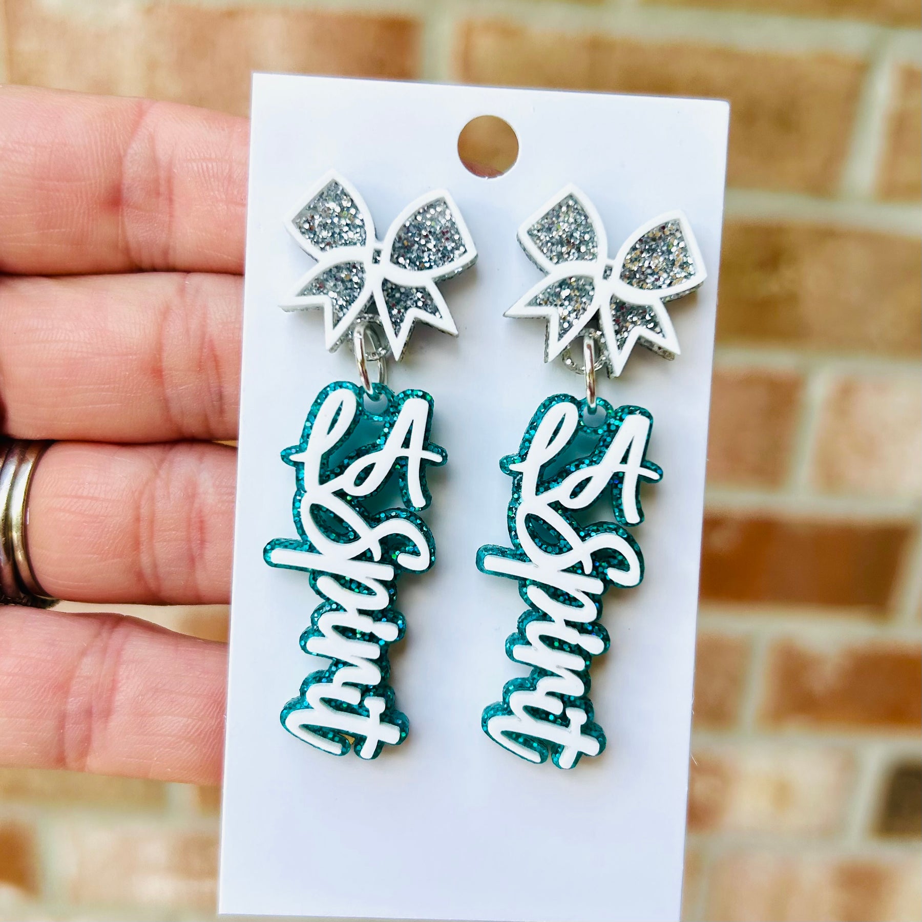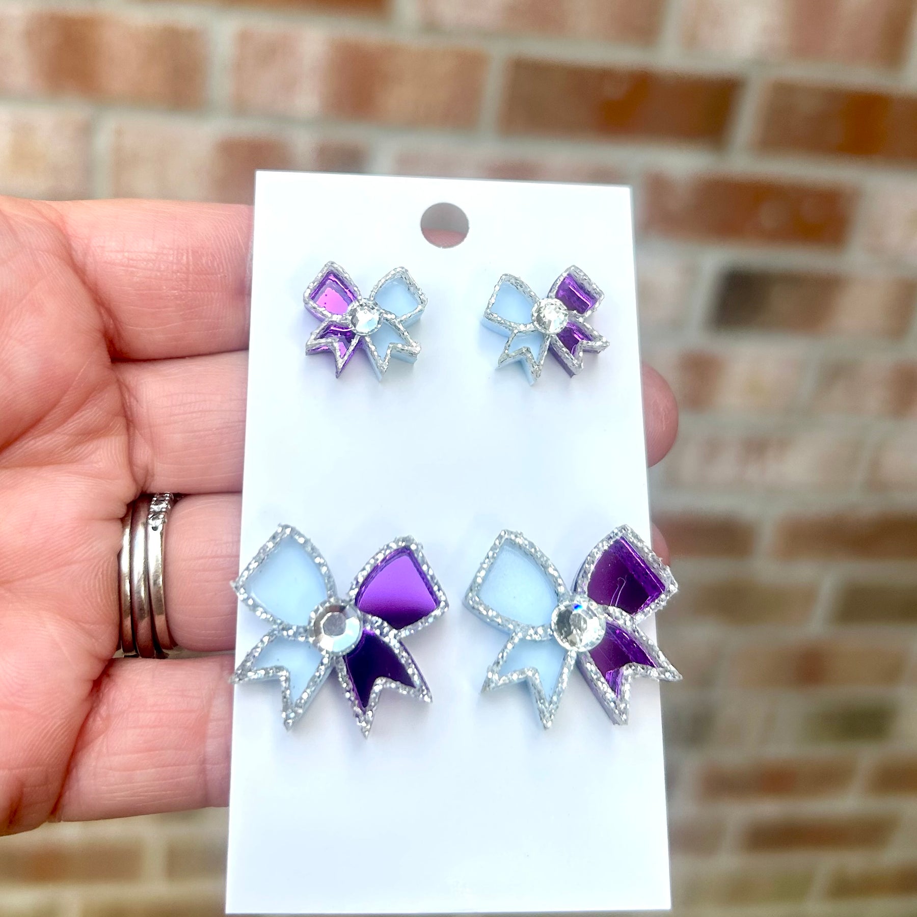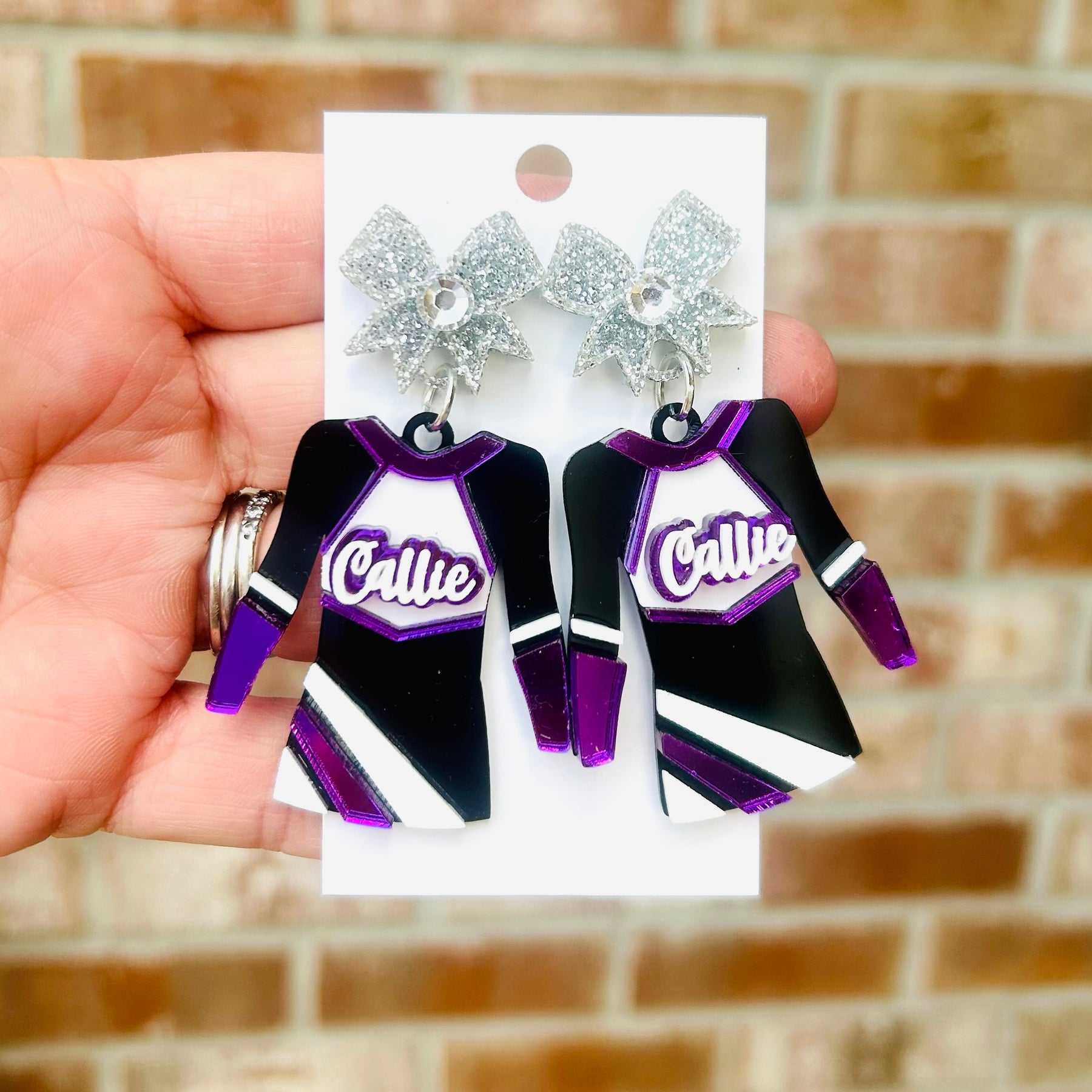 A range of custom cheer uniform earrings from sideline plain to full bedazzled for competition cheer.