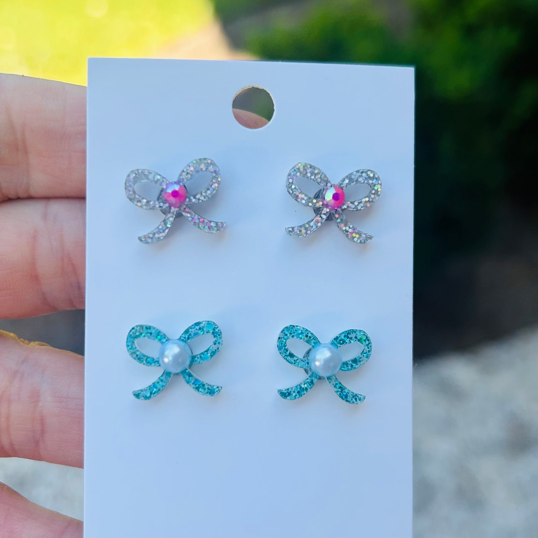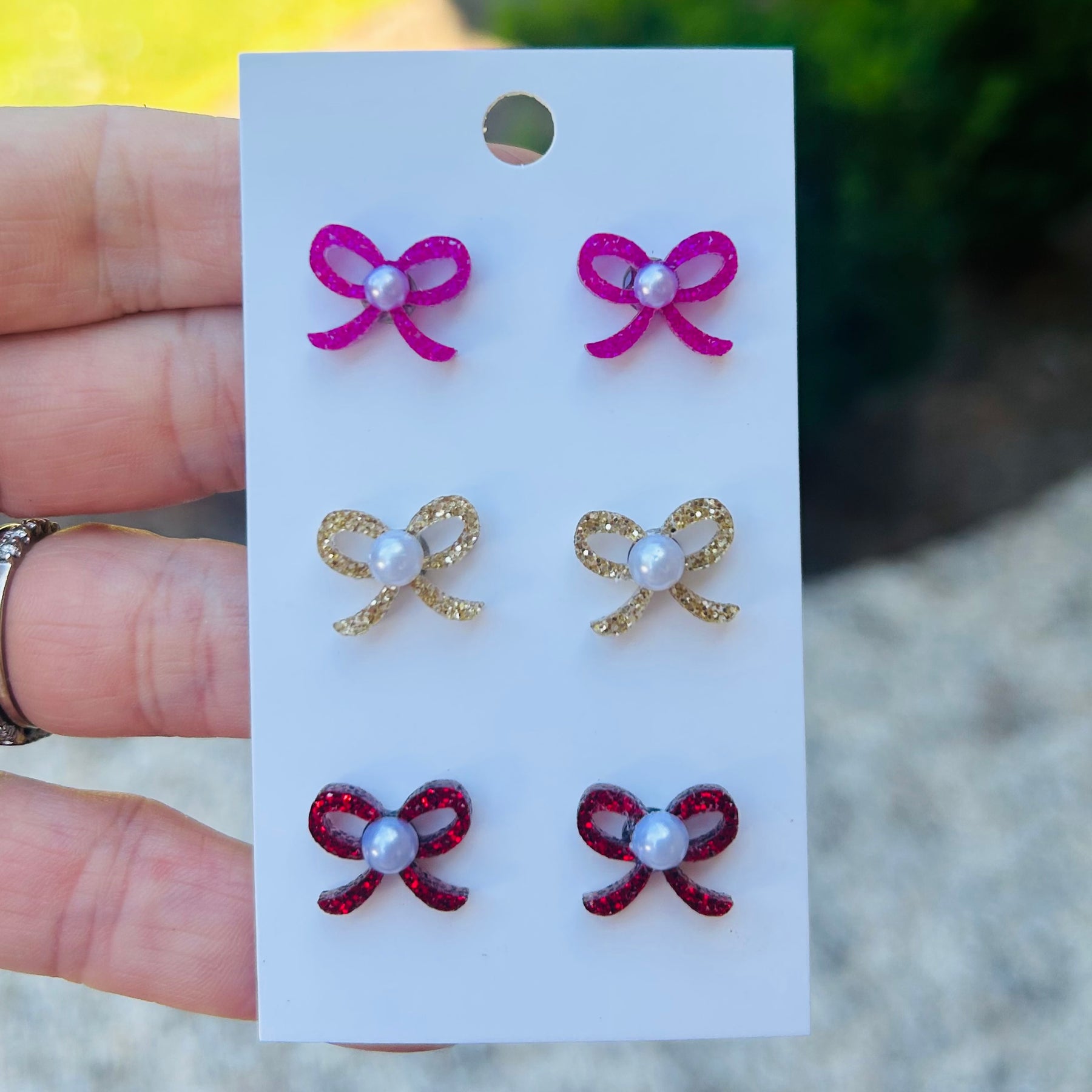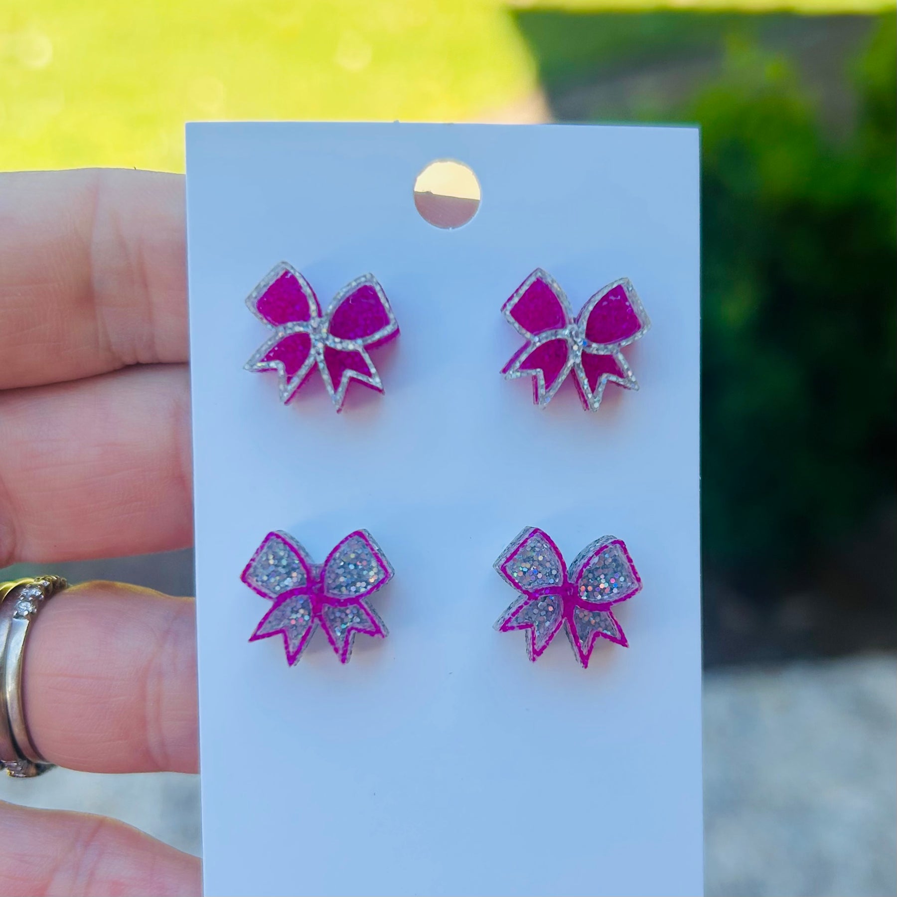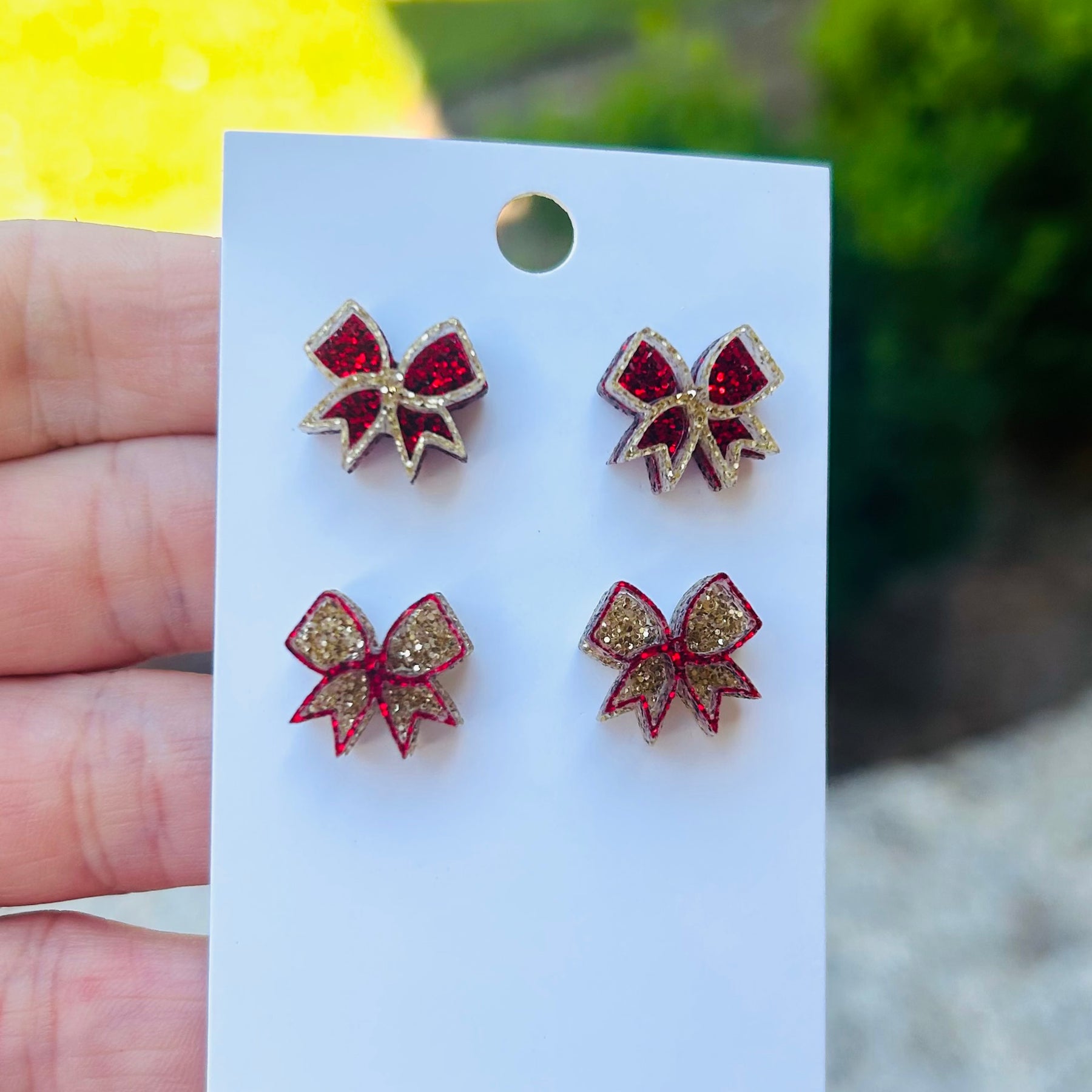 Tiny .5” small bow studs. Red bows and pink mixed glitter