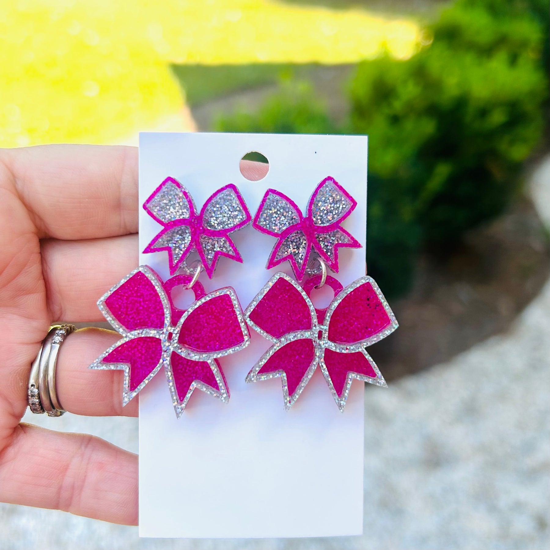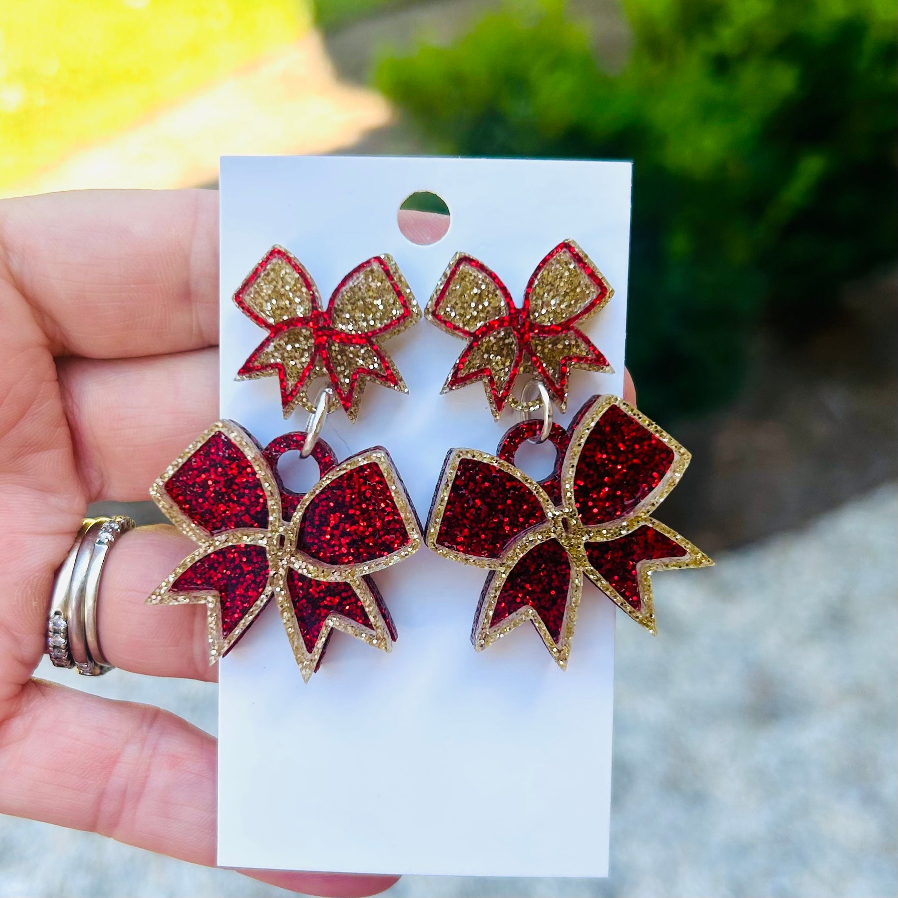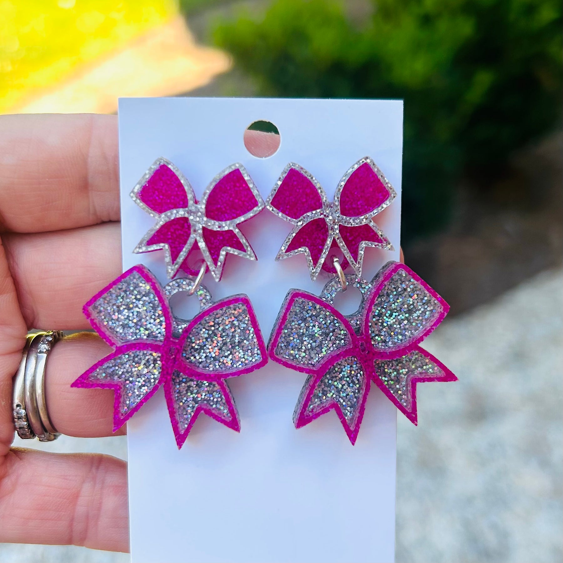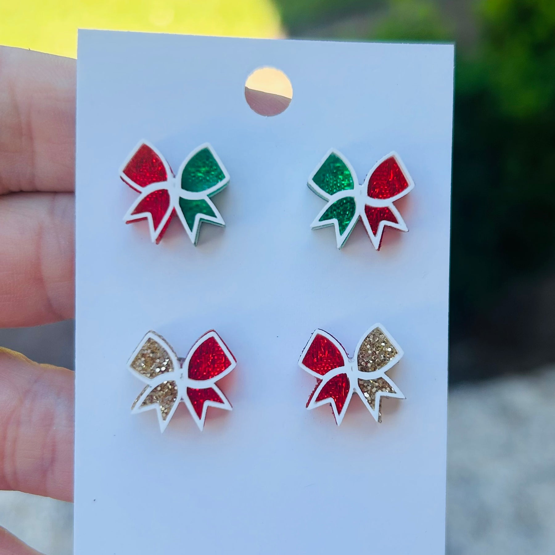 Tiny .5” small bow studs. Red bows and pink mixed glitter