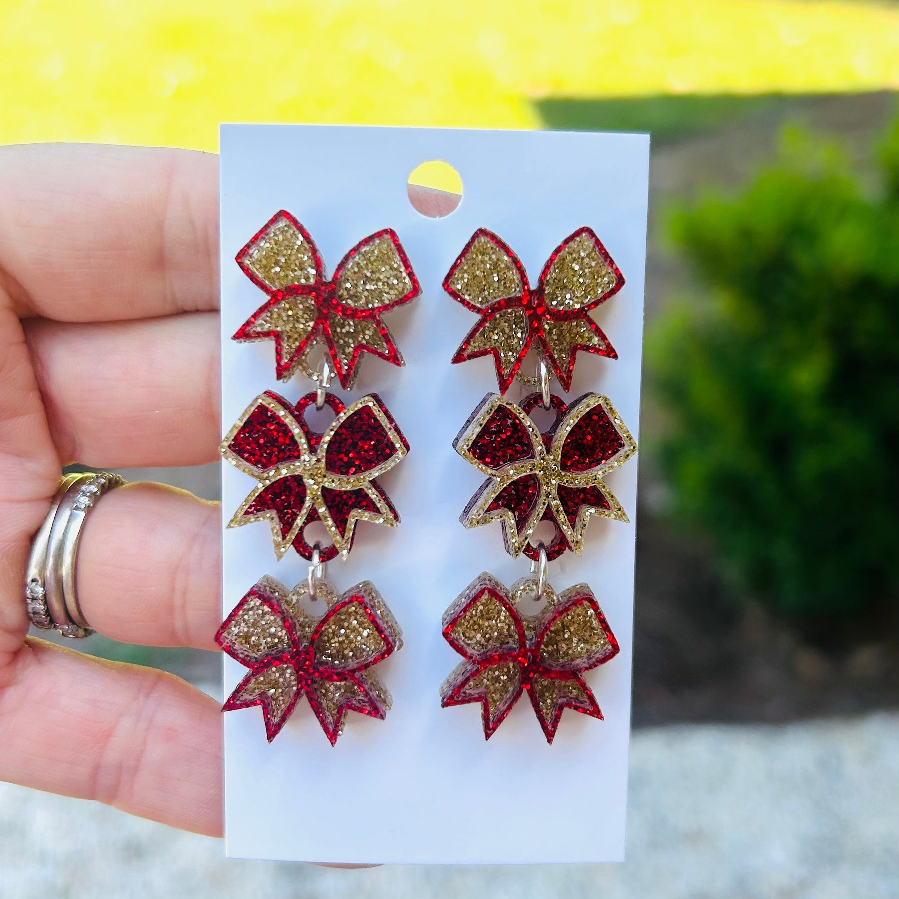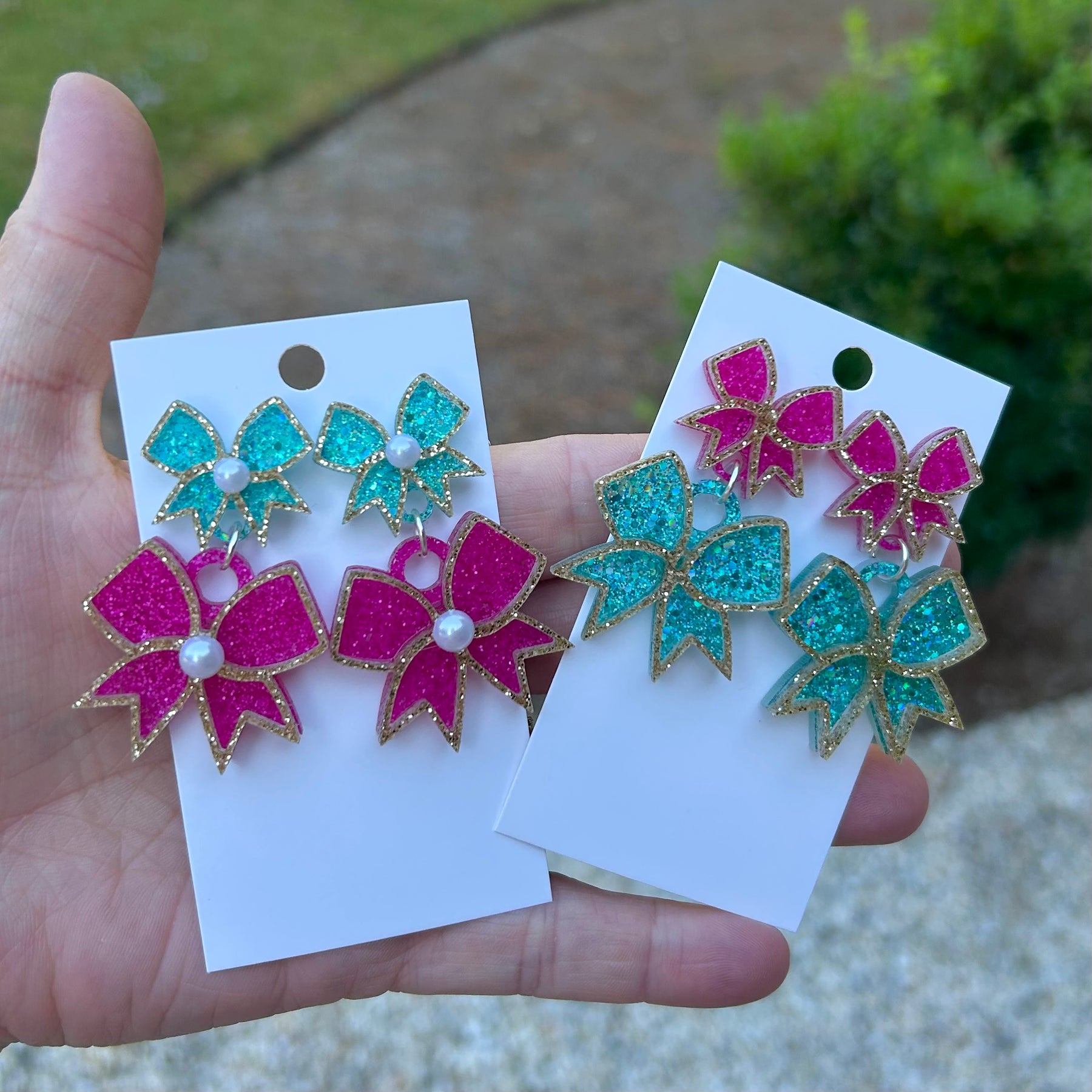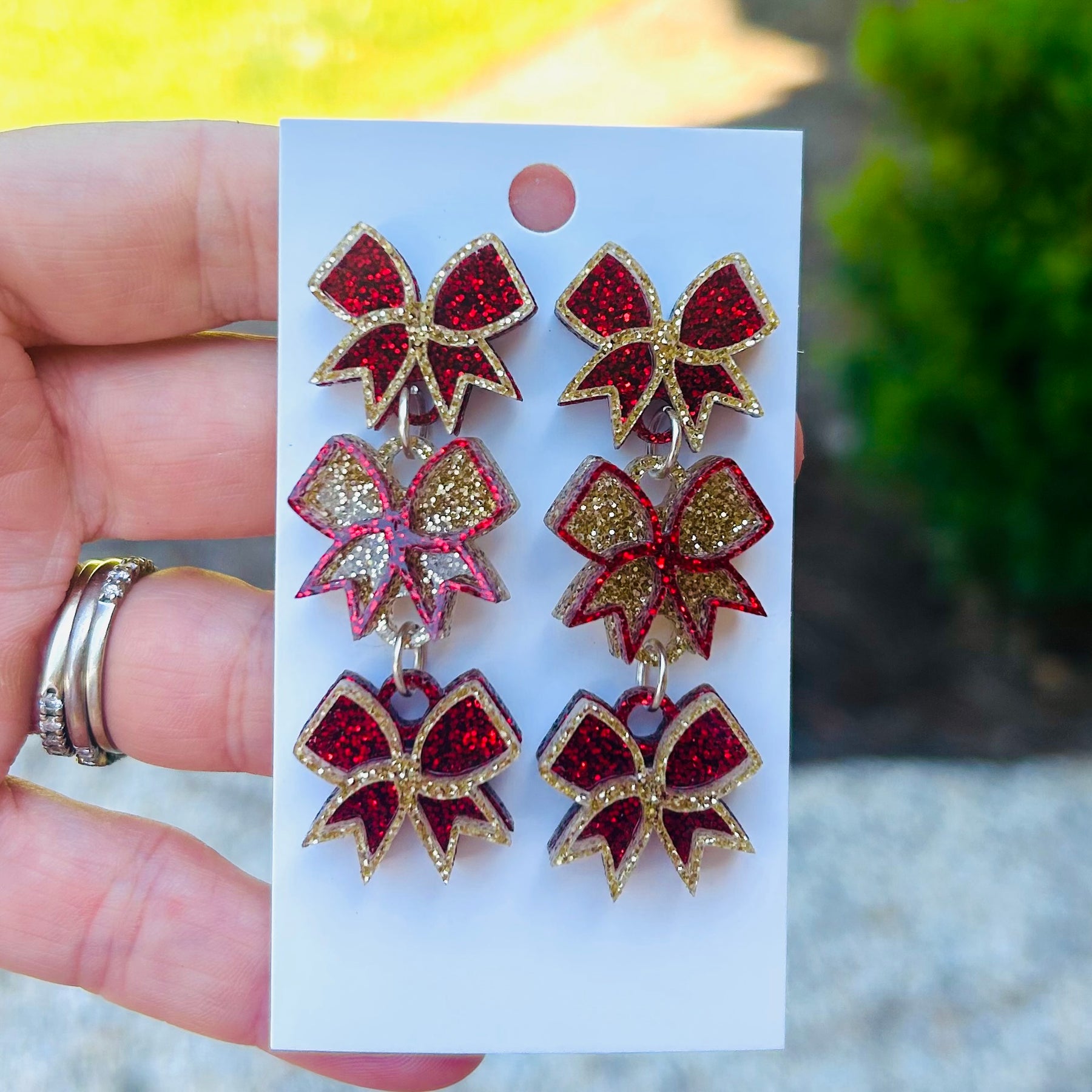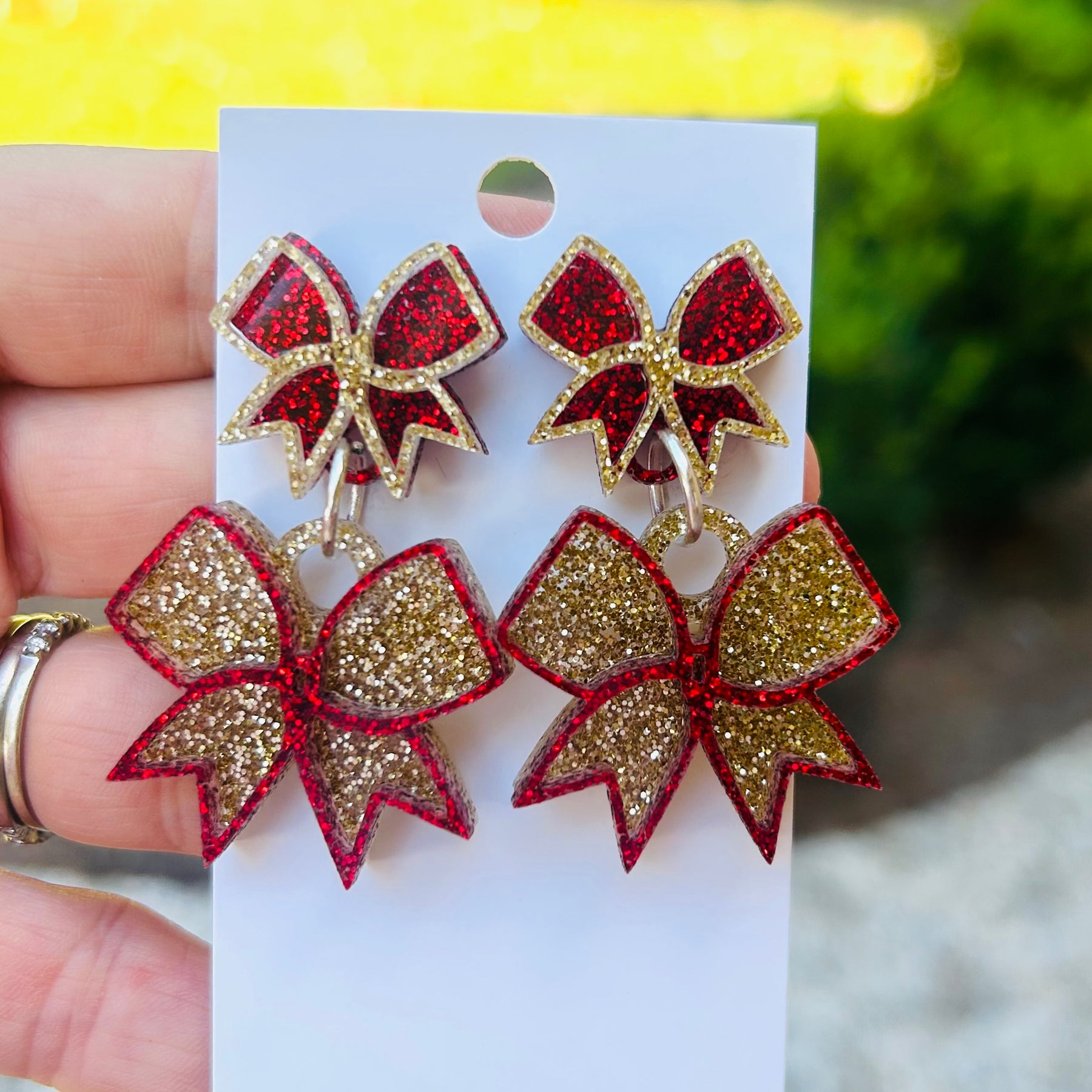 Tiny .5” small bow studs. Red bows and pink mixed glitter