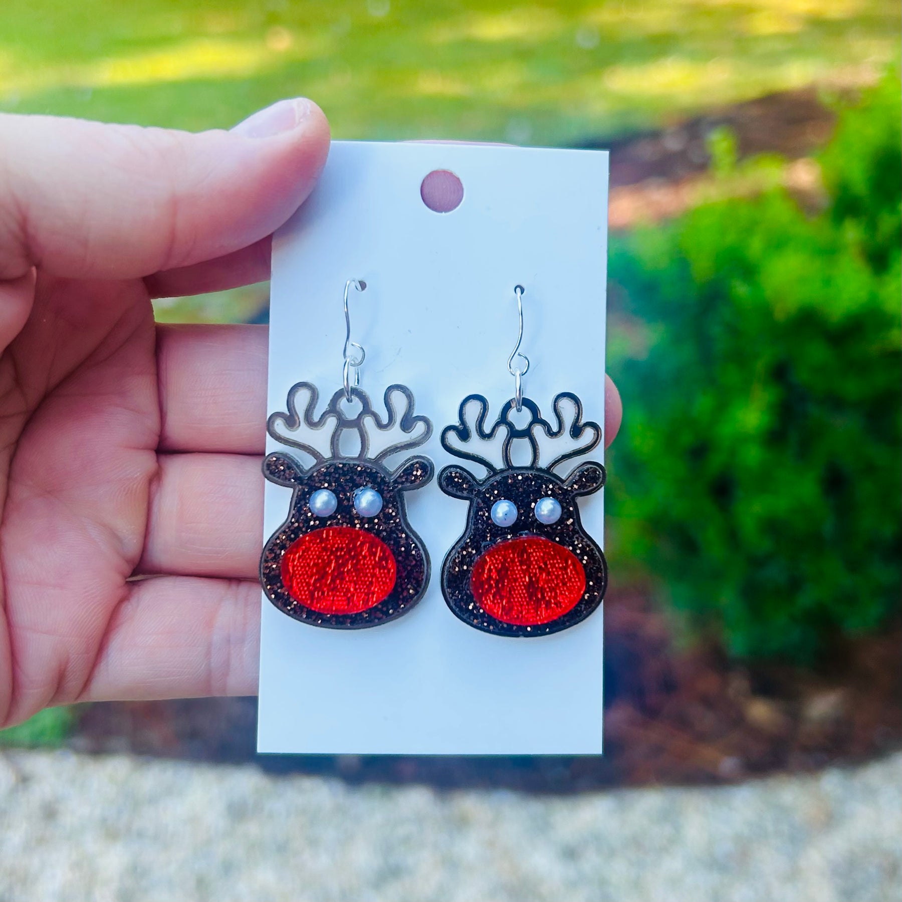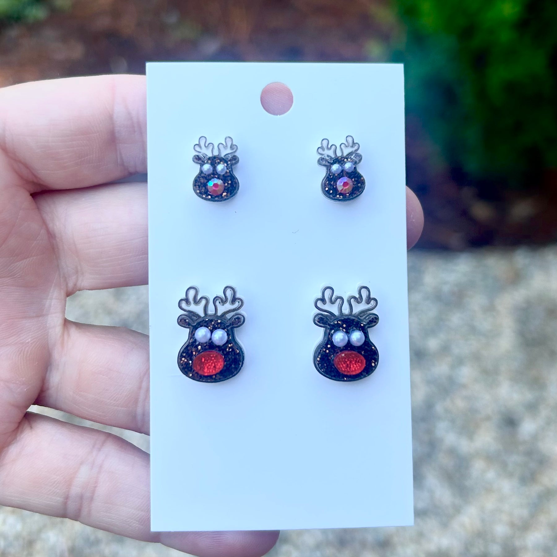 tiny studs, studs, dangles and bows. brown glitter and mirror with a red nose