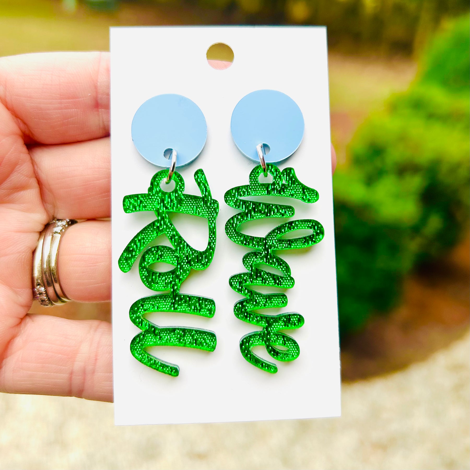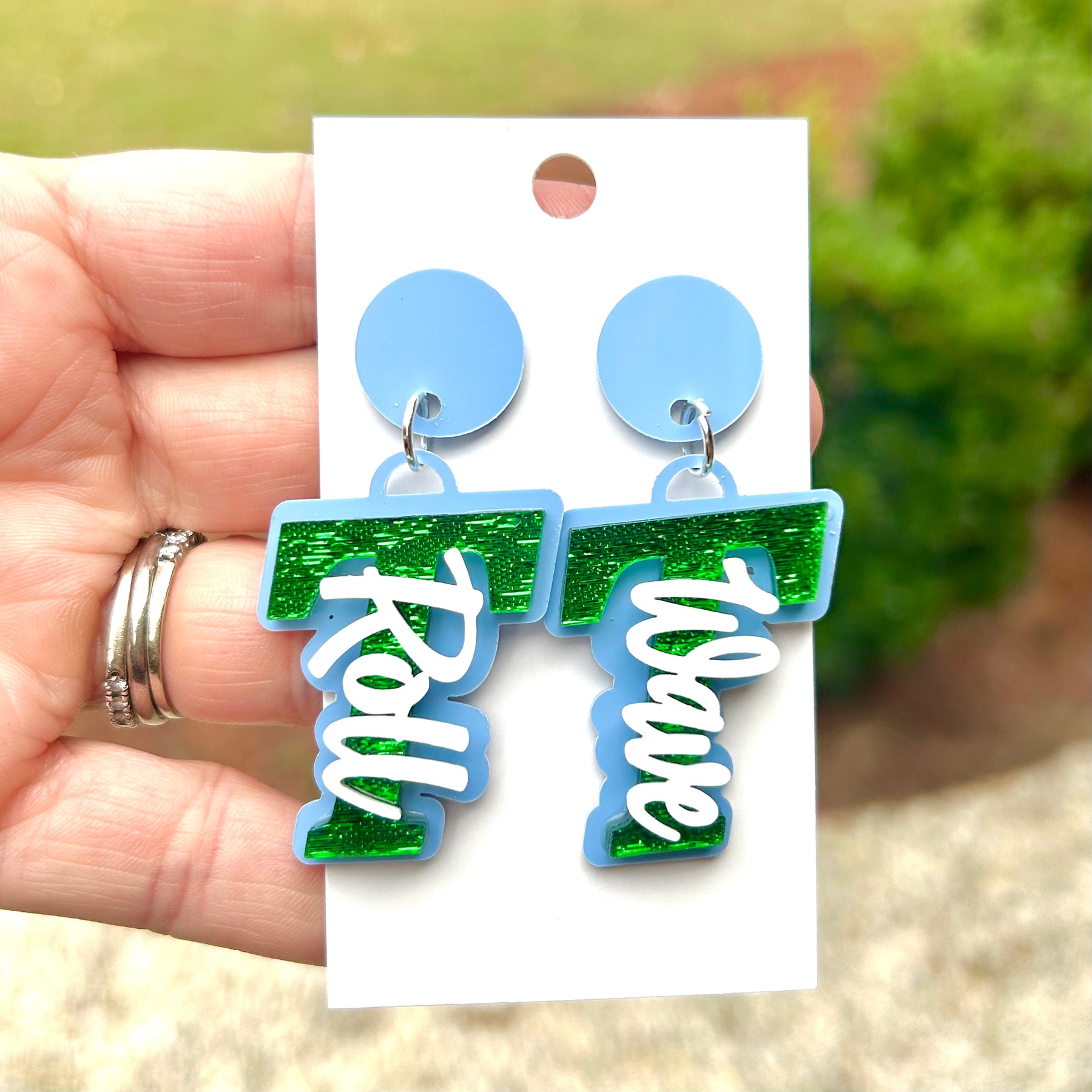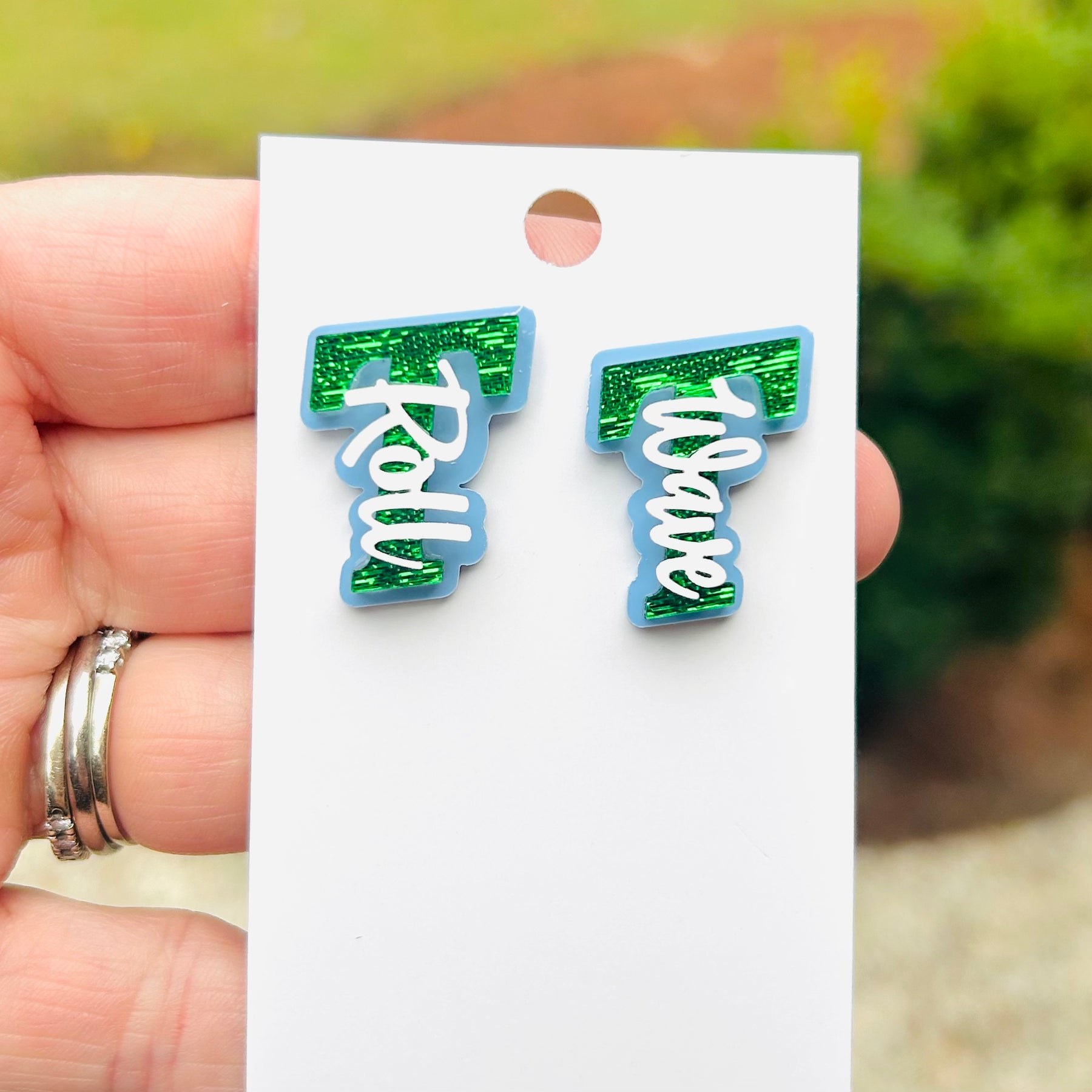 Baylor Bears. Green and athletic gold studs are Baylor Univeristy logo and the dangles are the logo as a stud with double layer bears as the dangle