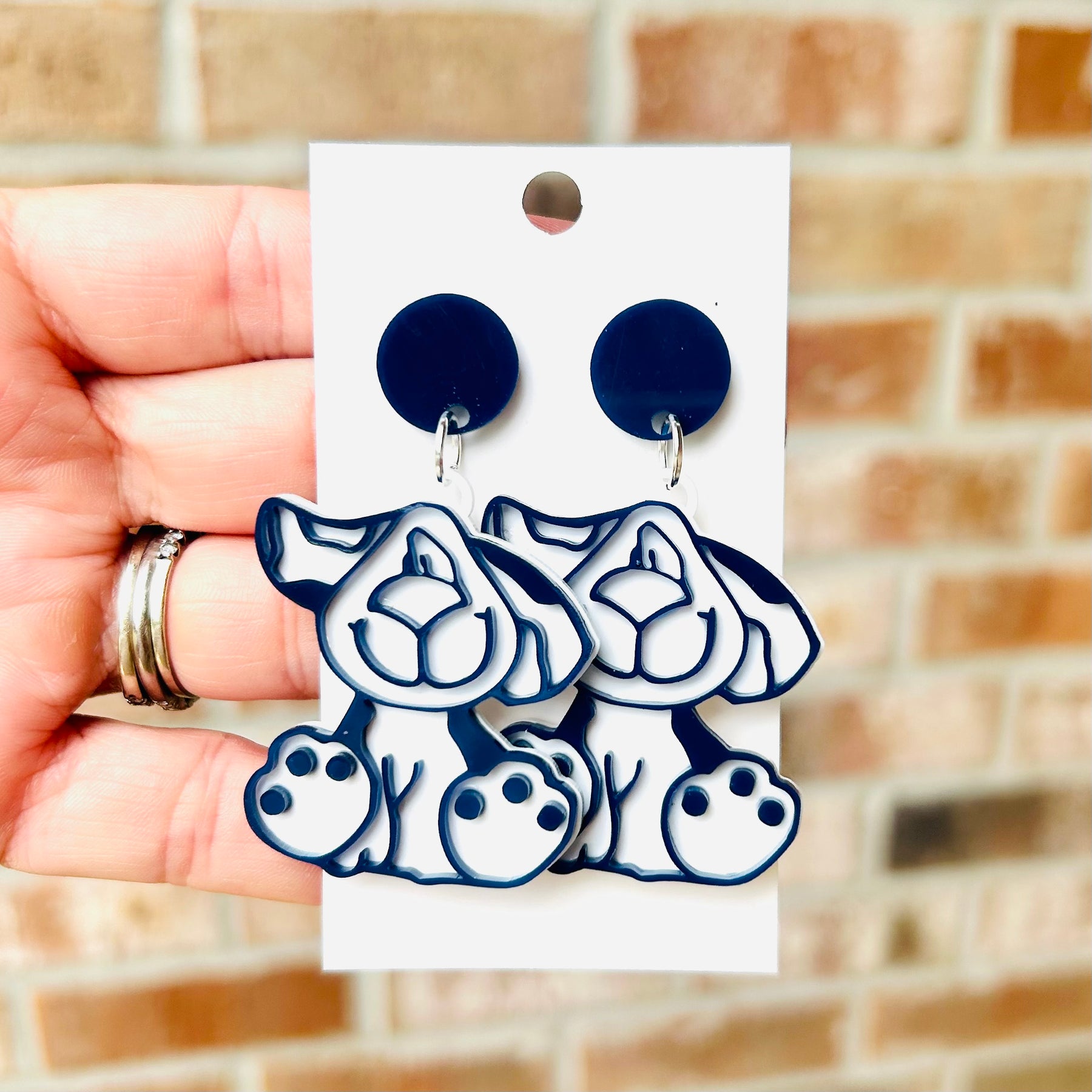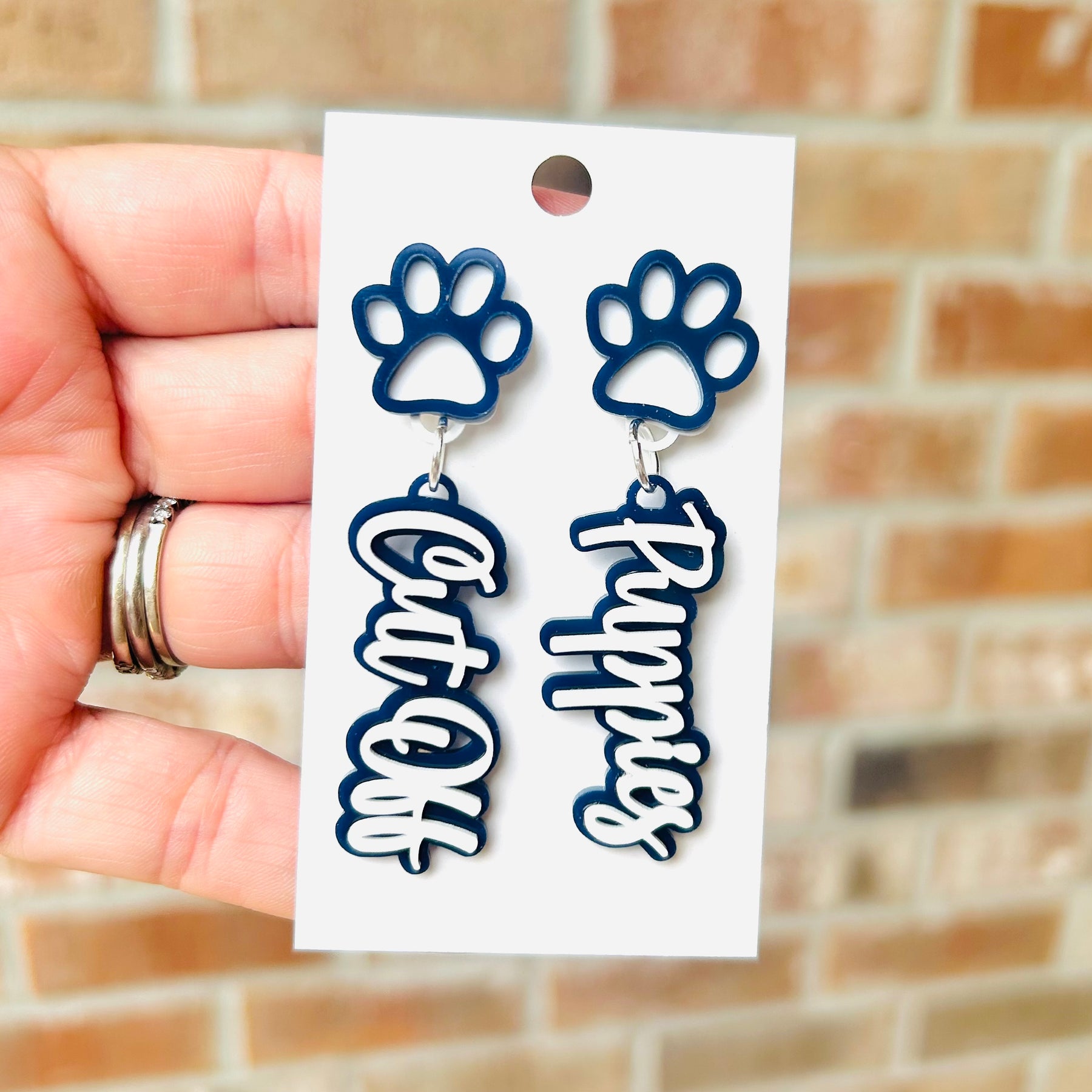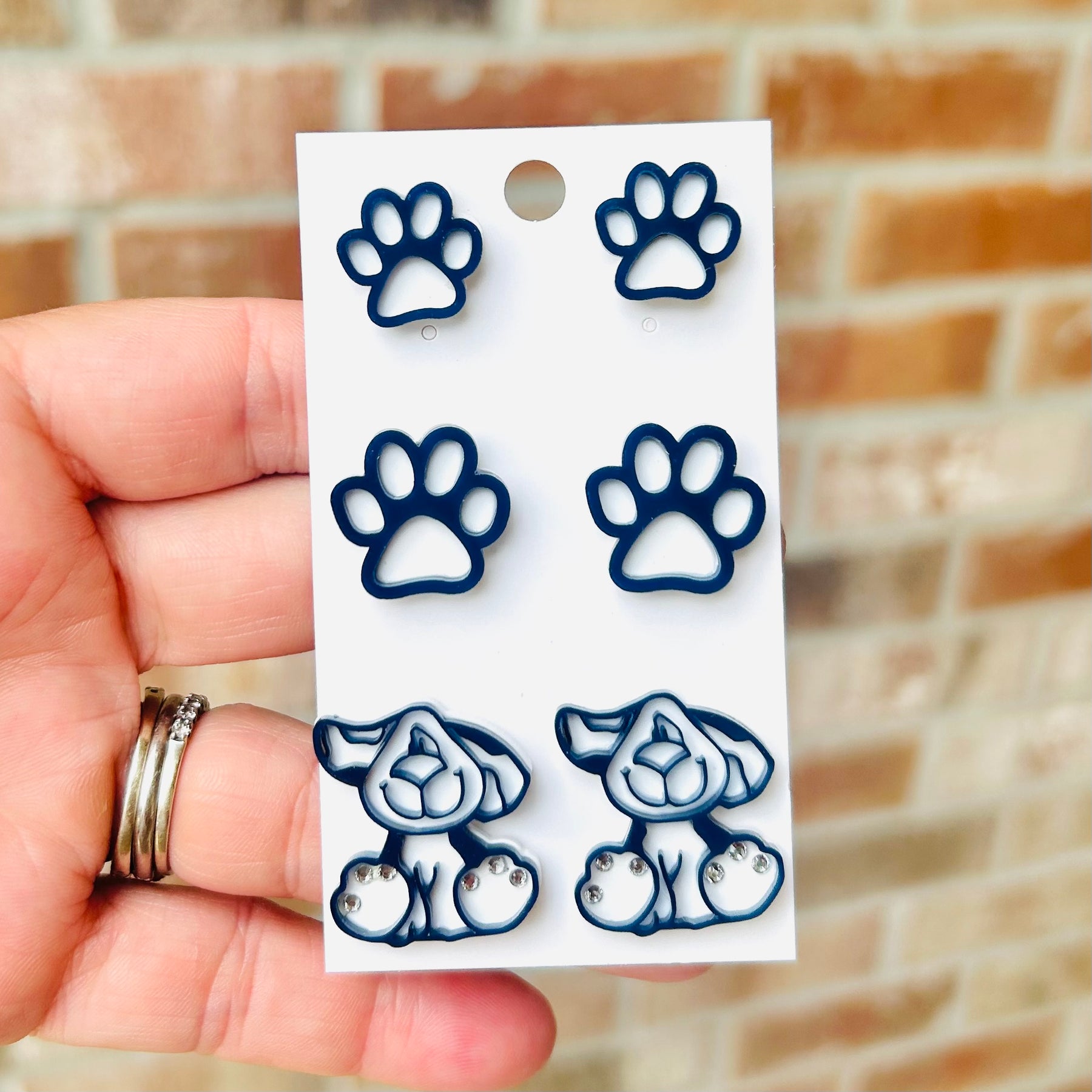 Cut off Puppies! Navy blue and white logo dangle and stud as well as paw studs and a paw dangle.