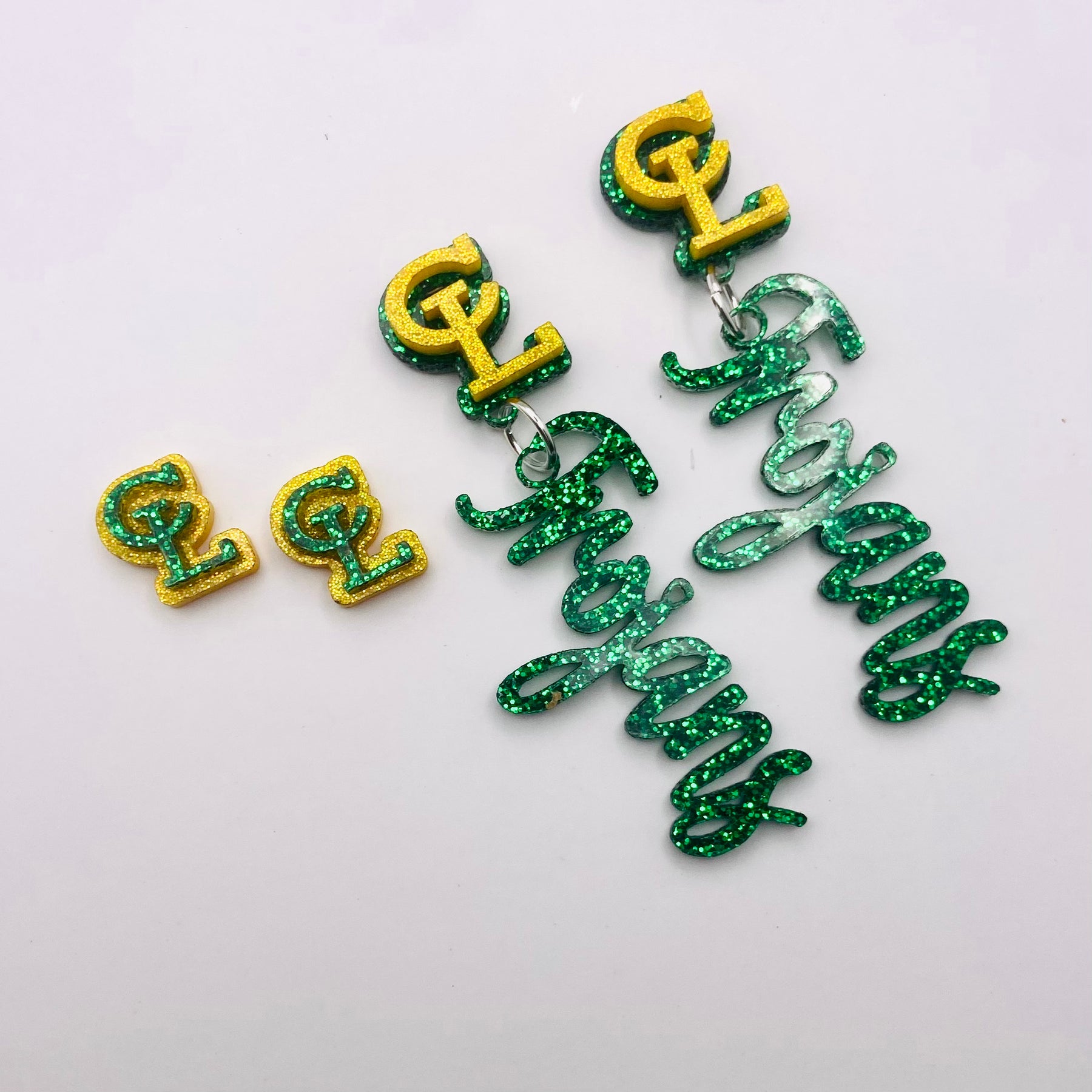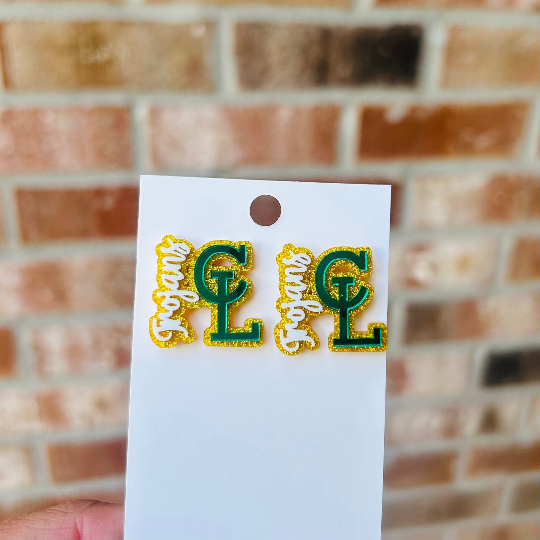 Gold CL logo with green background and Green Trojans Dangling. The stud is green CL logo with gold background.
