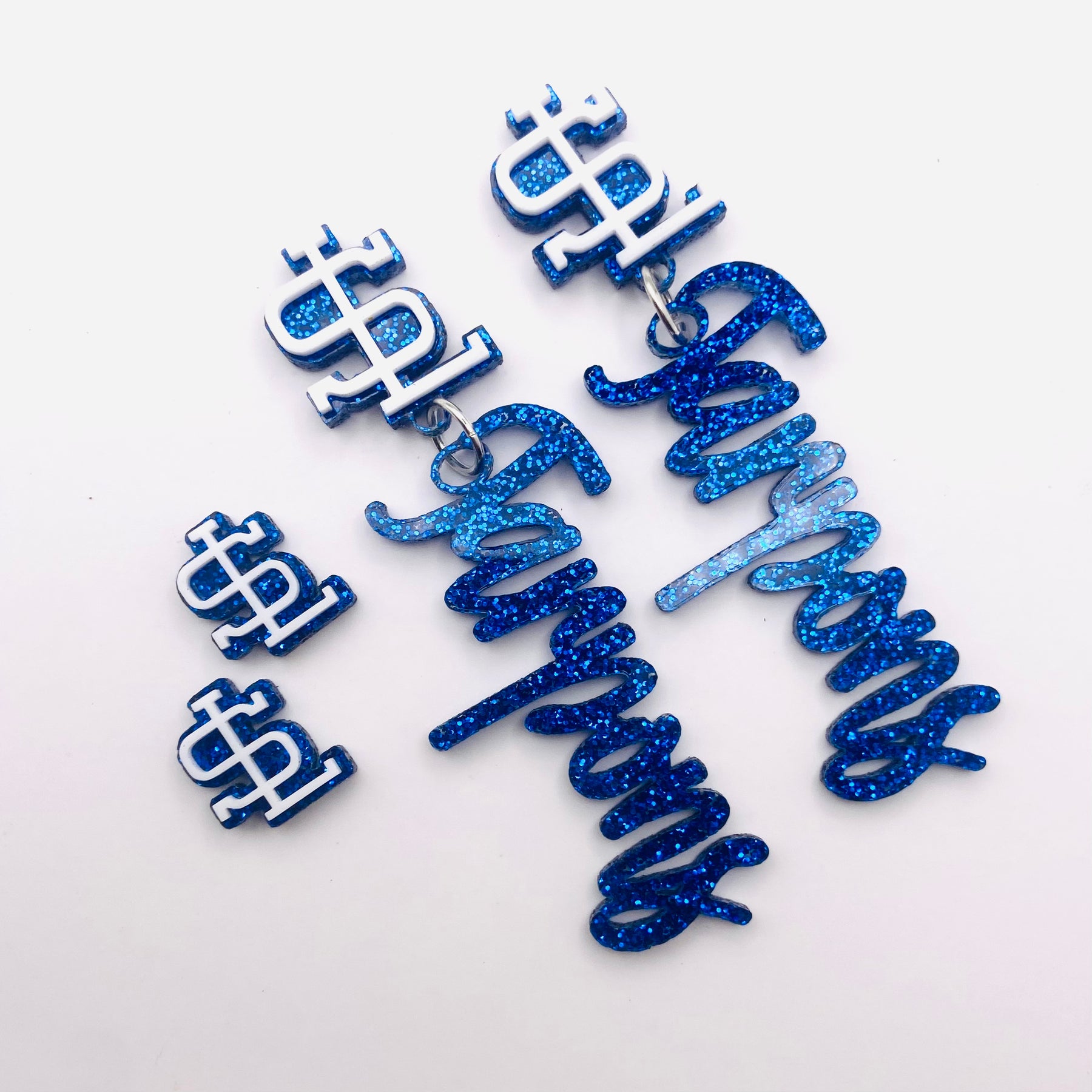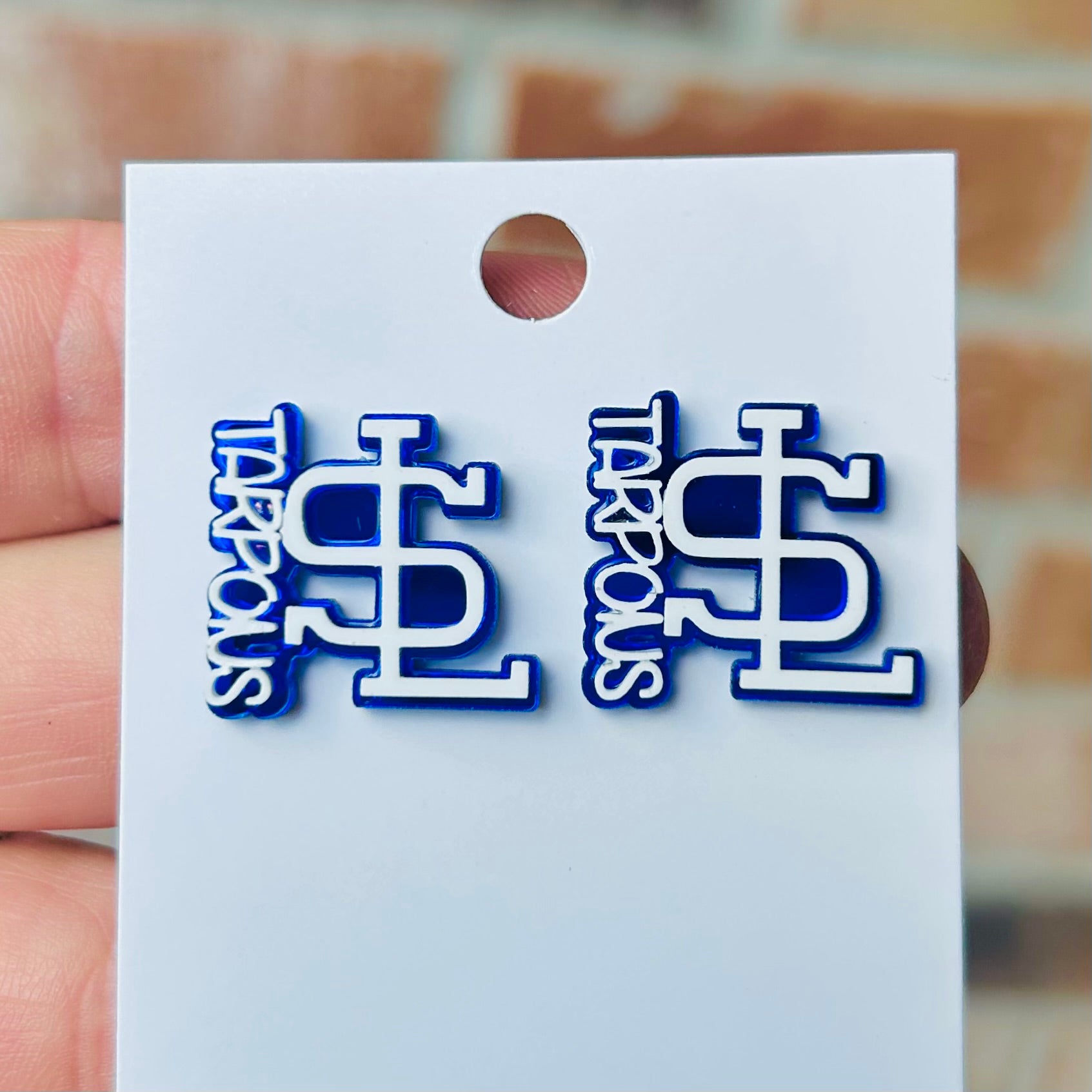 White South Lafourche logo with blue back stud and Tarpons Dangling. Studs are smaller white logo with blue glitter back.