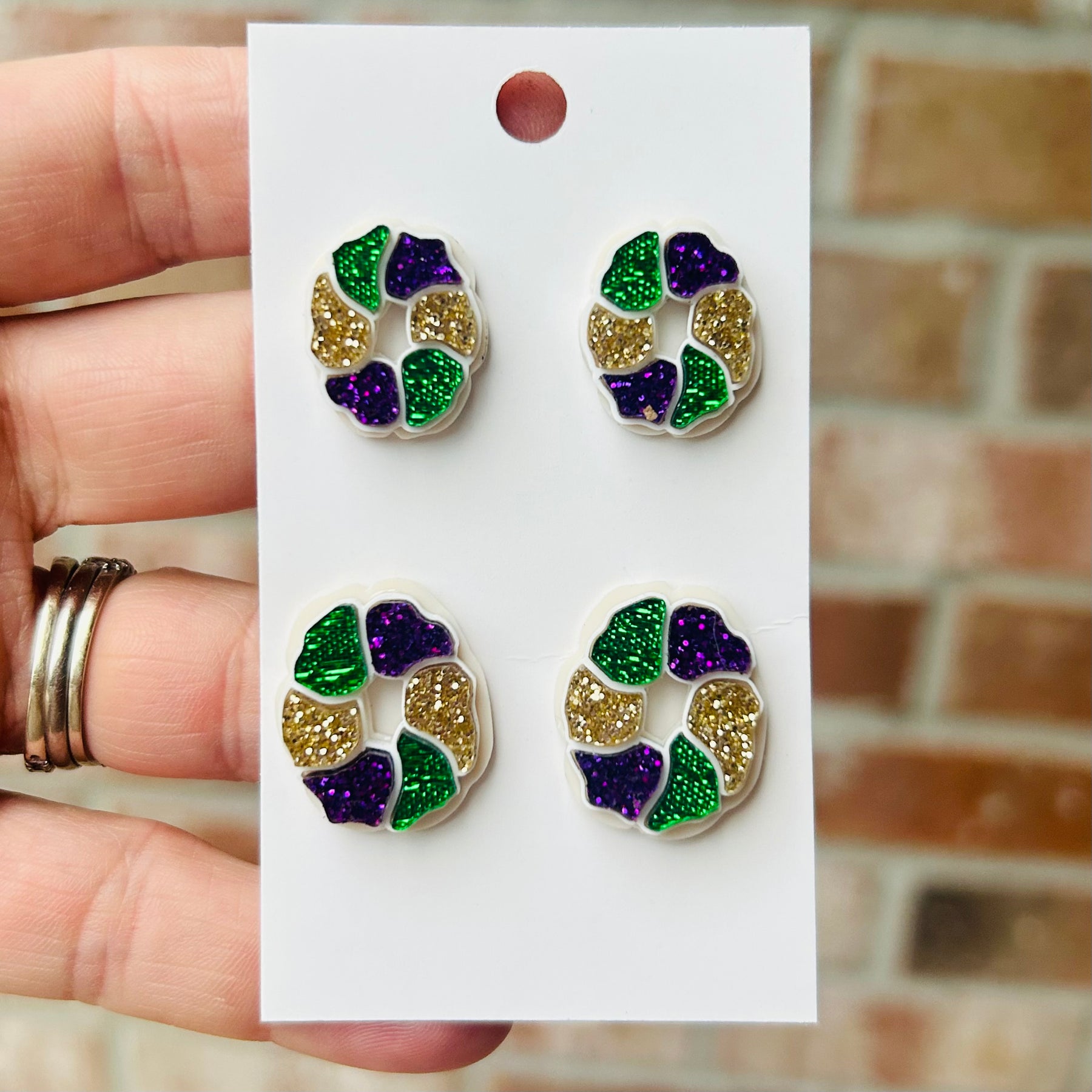 Purple green and gold Mardi Gras beads. Stud version and a dangle version