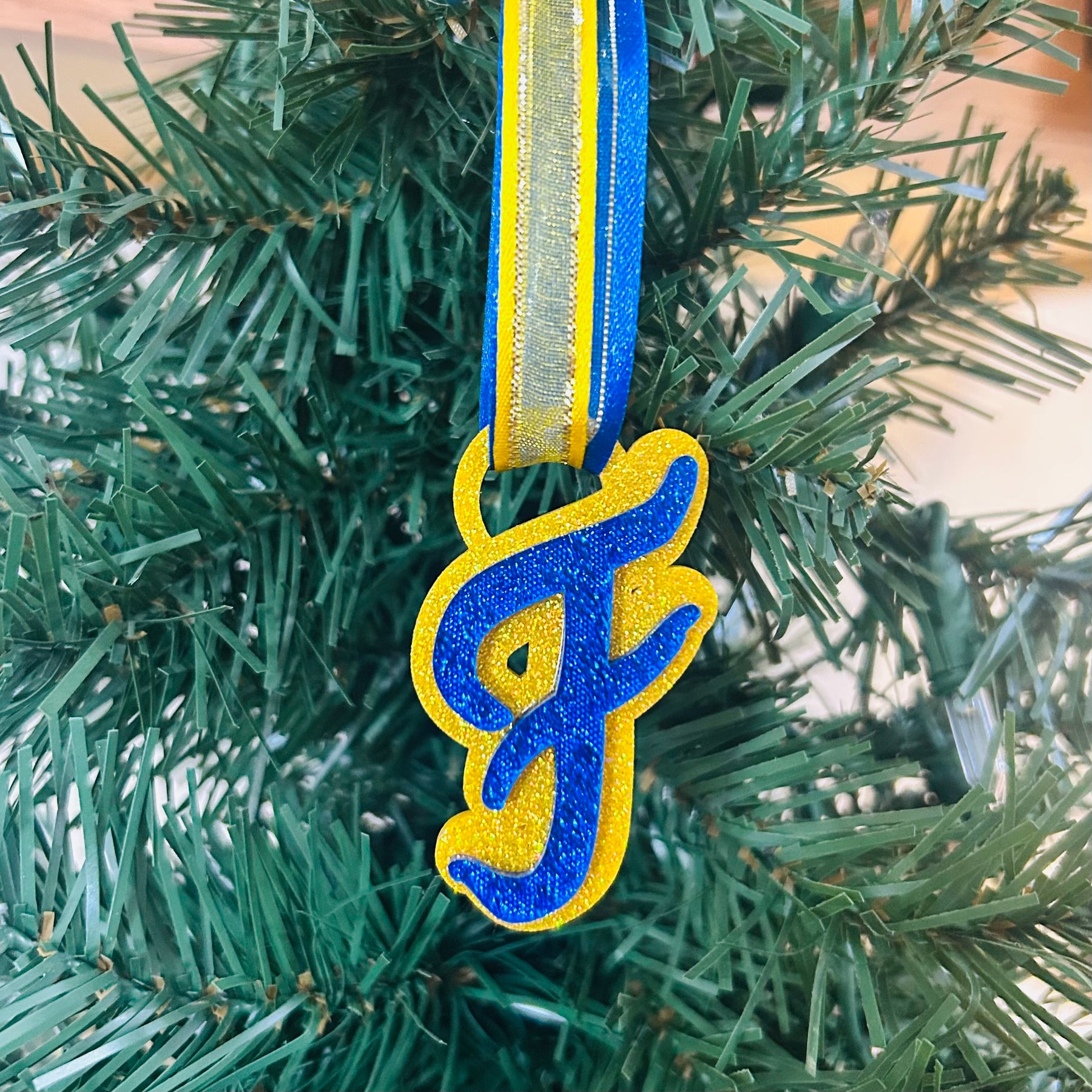 Mandeville High School Spinnakers Ornament . blue uniform, white cape and silver M