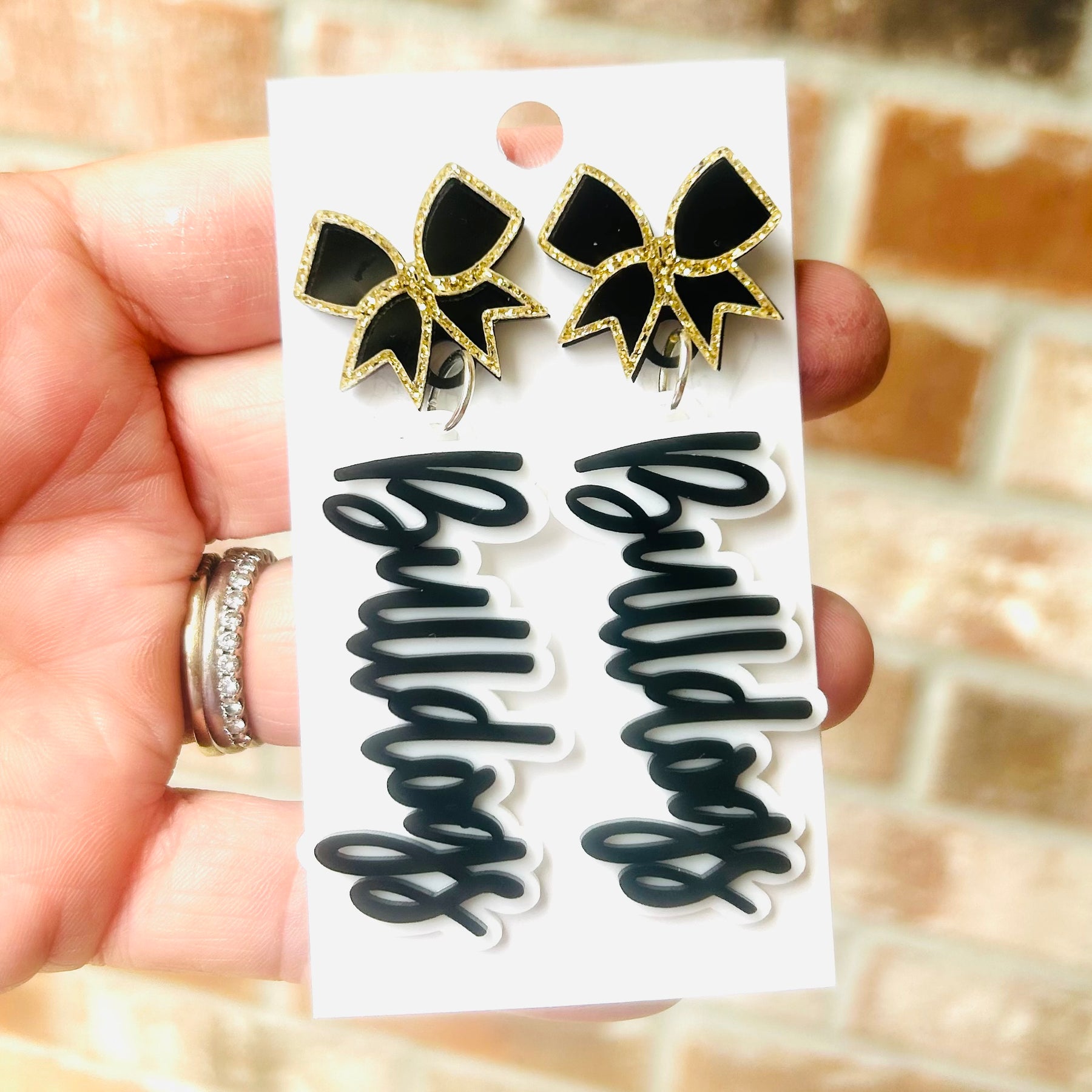 Double layer bow studs with double layer dangle with bulldogs