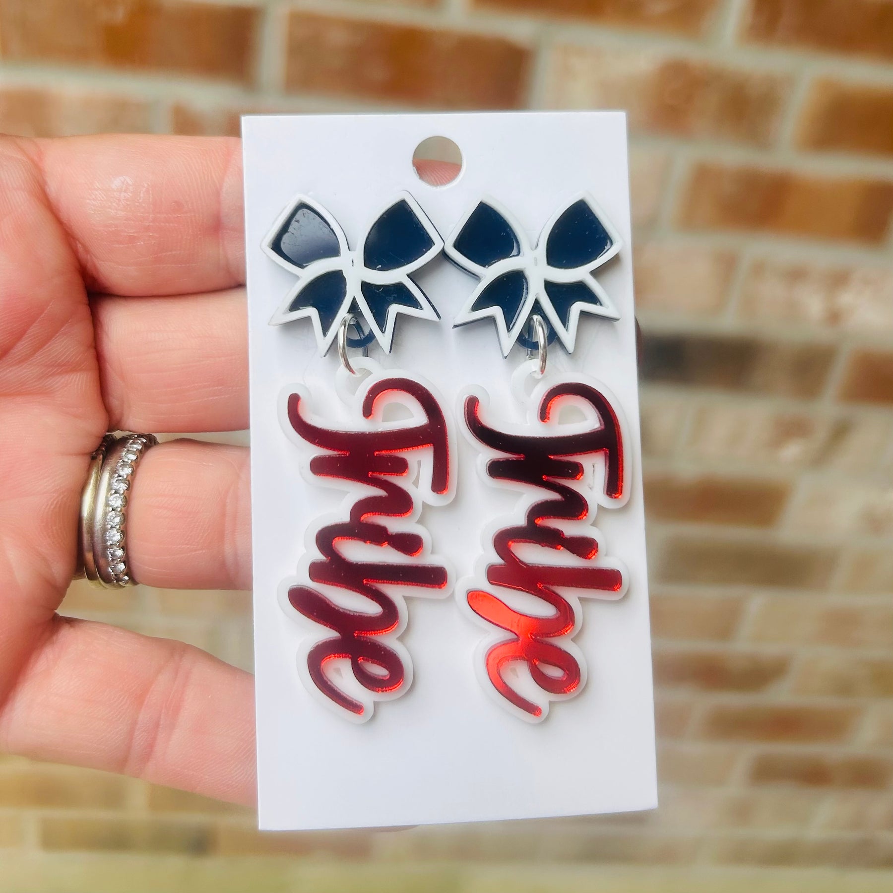 Bow stud with warhawks double layer dangle. They can be customized to any colors