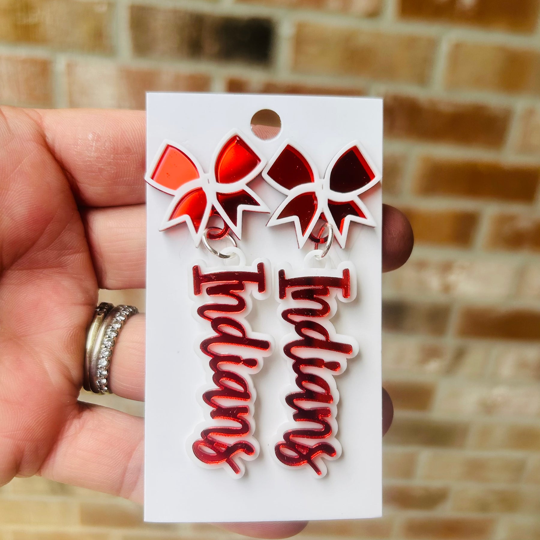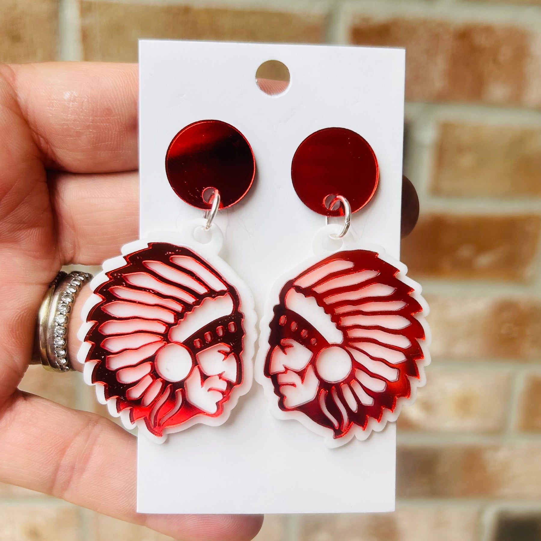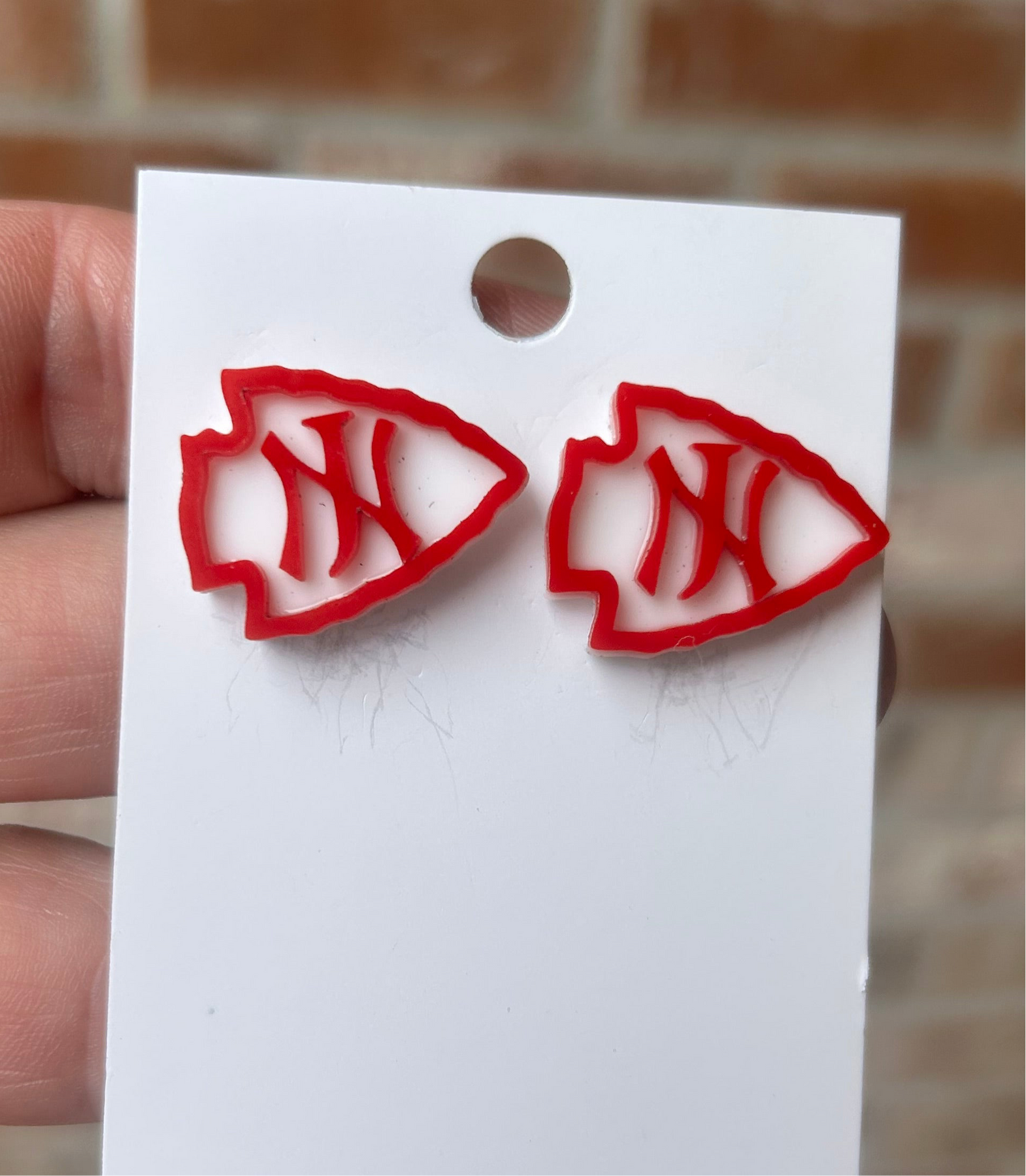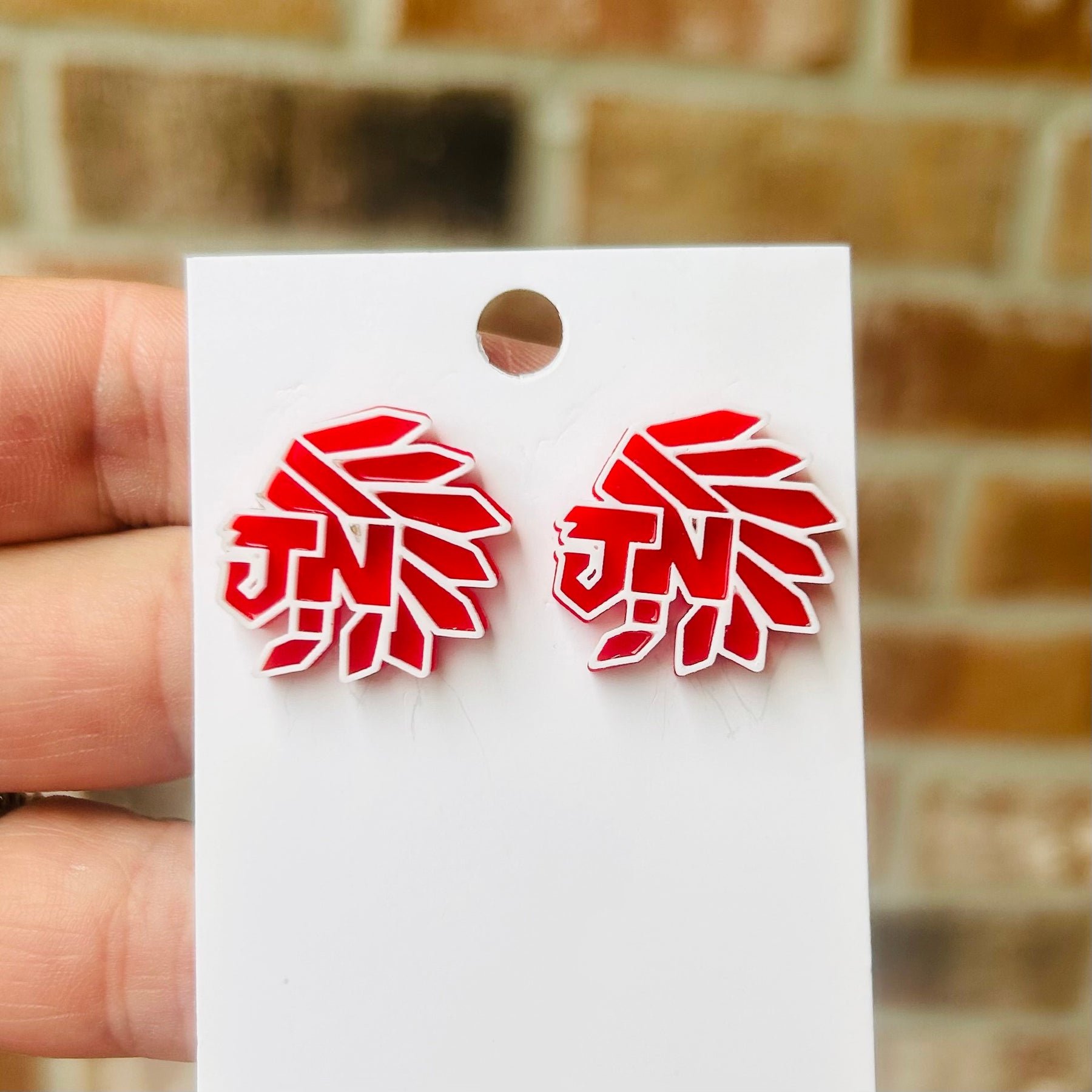 Jim Ned Indians earrings. Tribe. JN logo dangles. White black white and red